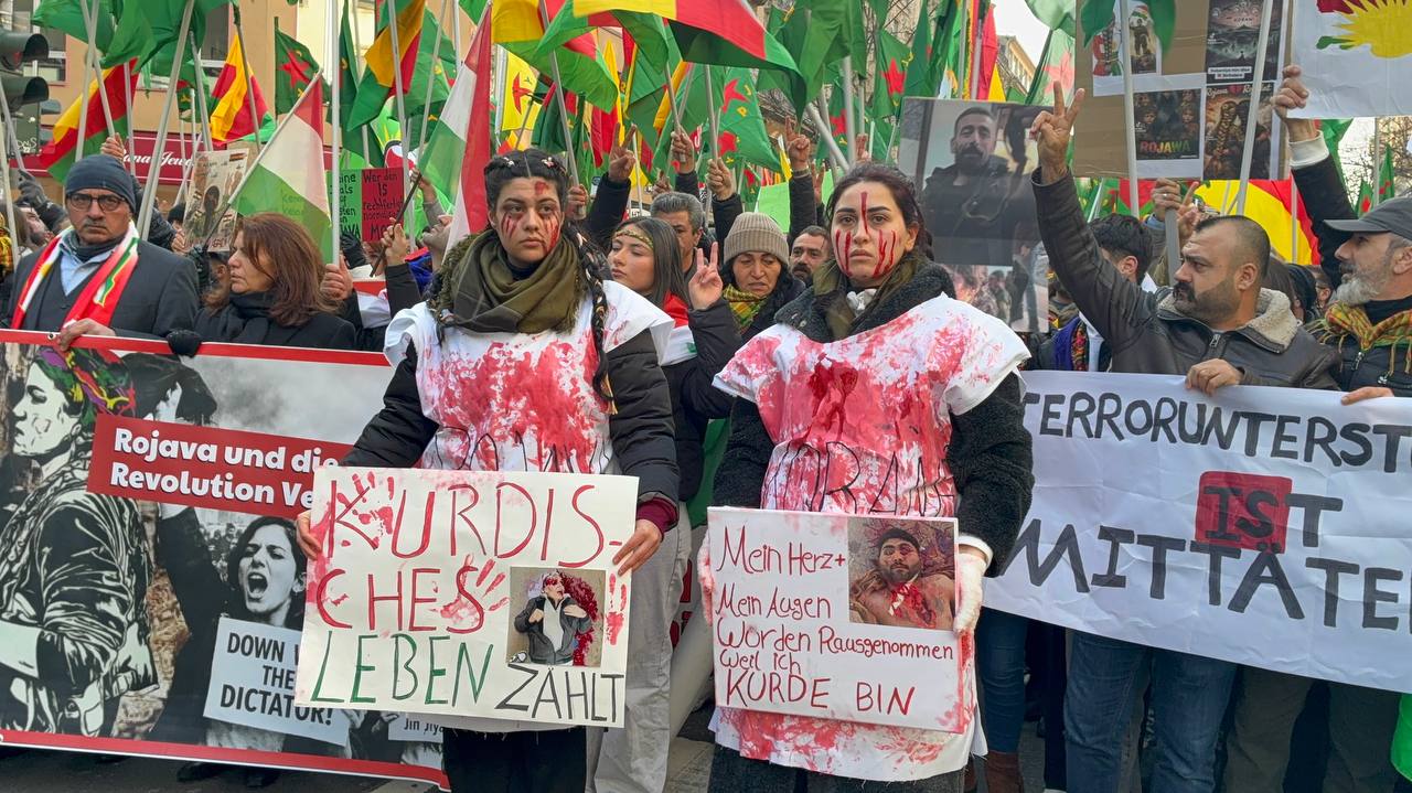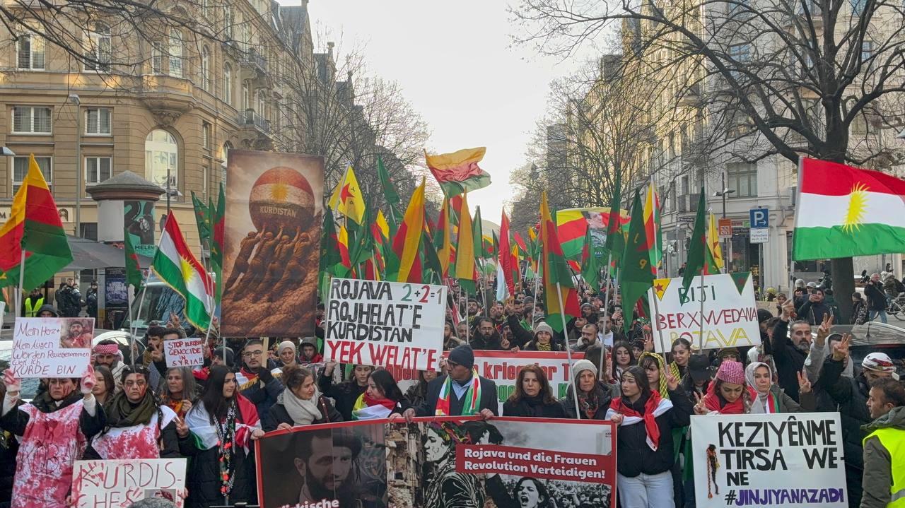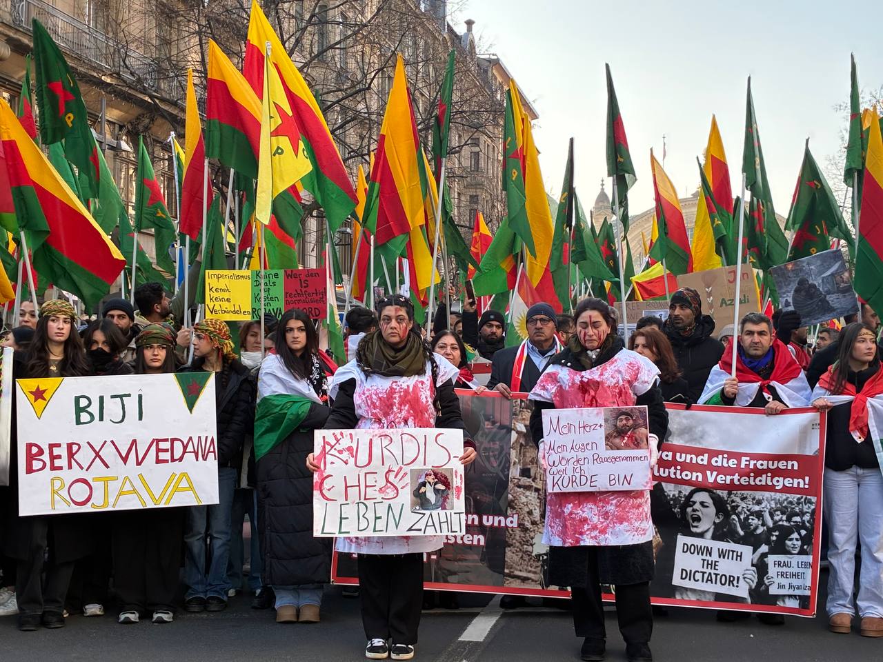 Saygı duruşu ve basın açıklamasının hemen ardından on binler coşkulu bir yürüyüşe geçti. Frankfurt’un ana arterleri, meydanları ve caddeleri ‘’Bijî Berxwedana Rojava!, Katil Colani!, Rojava direniyor!, Jin, Jiyan, Azadî!, Bijî berxwedana Rojavayê Kurdistanê!’’ sloganlarıyla inledi. Gençlik ve kadın öncülüğünde yürüyüş adeta bir direniş korosuna dönüştü; sloganlar gökyüzüne yükselirken yumruklar sıkıldı, bayraklar dalgalandı.