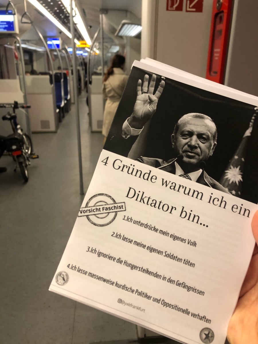 FRANKFURT– Kürdistanlı Öğrenciler Birliği (YXK) ve Kürdistanlı Kadın Öğrenciler (JXK) aktivistleri, “Neden diktatörüm” sloganıyla Frankfurt’un yerel toplu taşıma sisteminde Salı günü bir el ilanı kampanyası düzenlediler.