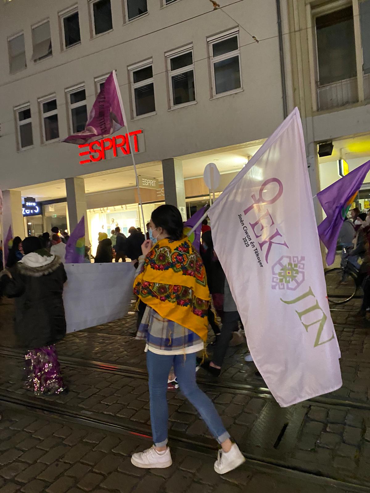 Saat 17’de Stühlinger Kirchplatz kadınların toplanması ile başlayan yürüyüşte TekoJIN aktivisti genç kadınlar kendi bayrak ve pankartlarıyla eylemde yer aldı. Sık sık ‘Jin, Jiyan, Azadî’ sloganlarıyla sokakların yankılandığı yürüyüşte, çalınan Kürtçe marş ve şarkılar yürüyüşe güzel bir renk kattı.