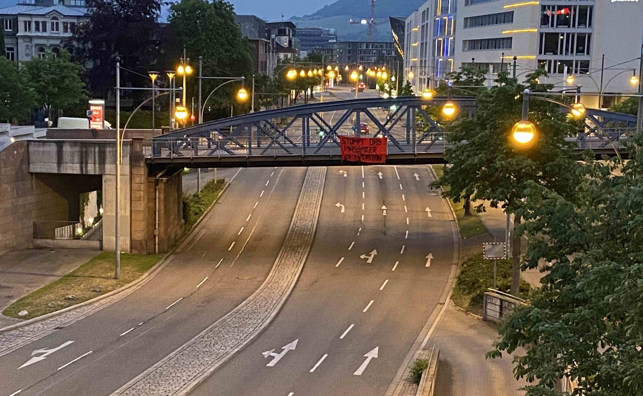 Tevgera Ciwanên Şoreşger ve Jinên Ciwan ên Azad aktivisti gençler, faşist Türk devletinin Güney Kurdistan’da Mexmûr ve Zînî Wertê alanına saldırısına karşı Almanya’nın Freiburg kentinde bir üst geçide pankart astı.