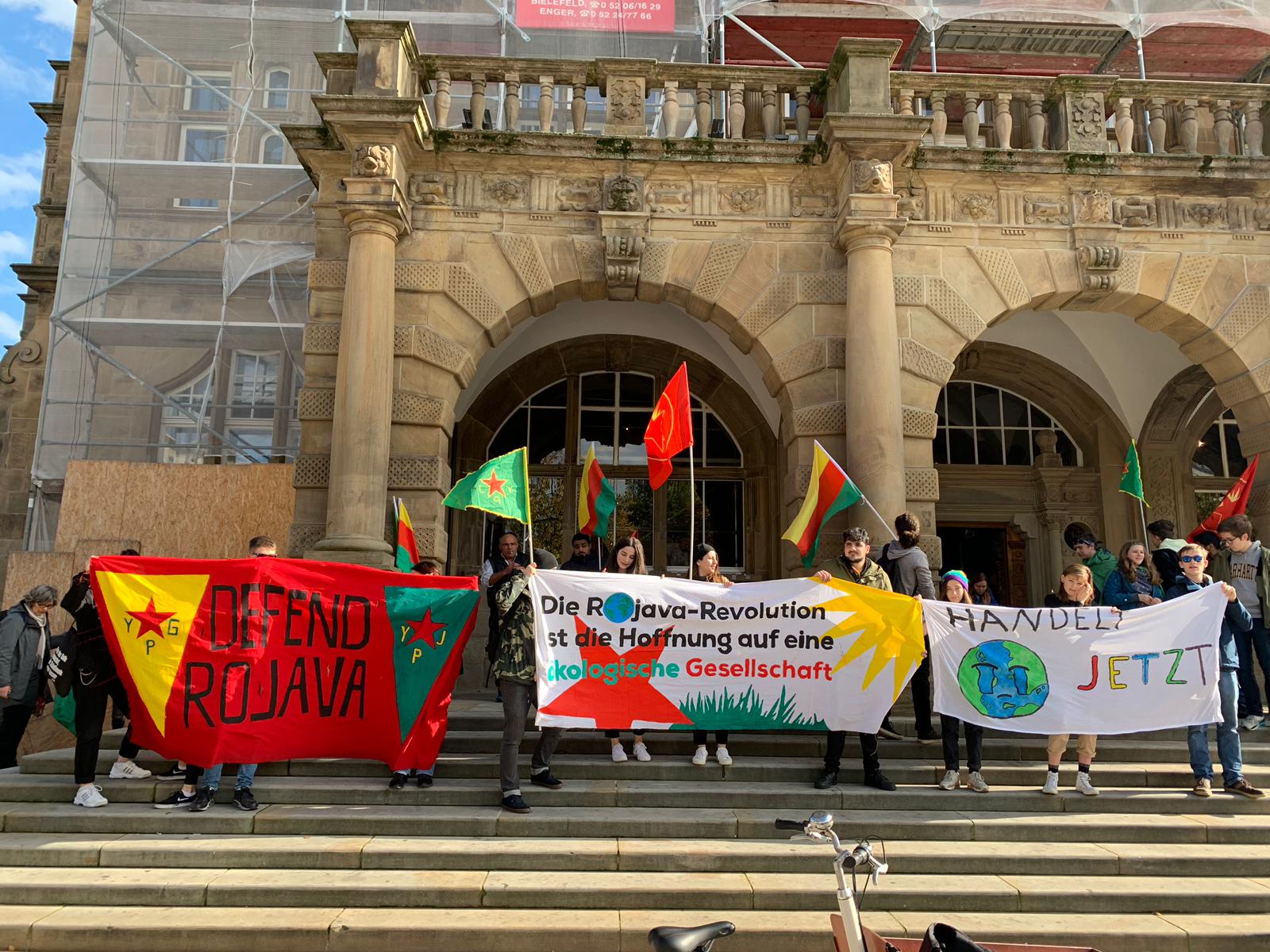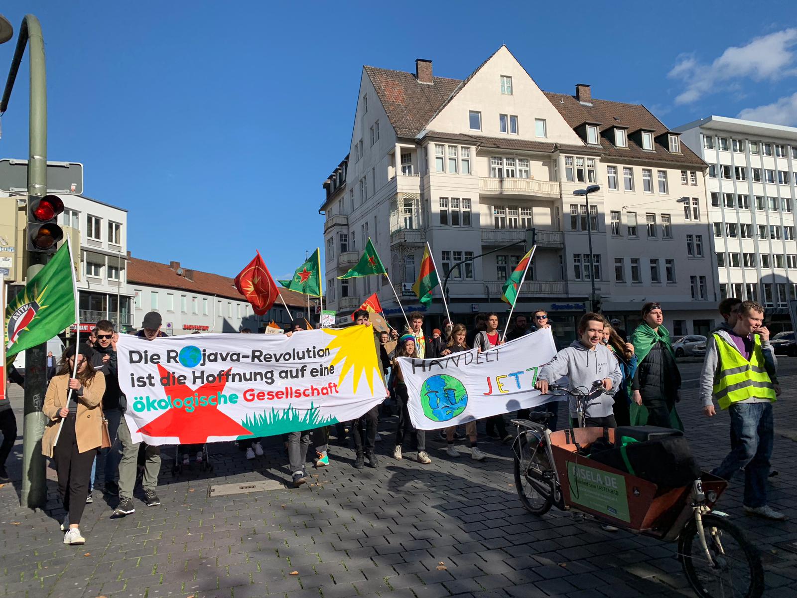 BIELEFELD – Kürt gençleri ve Fridays for Future (Gelecek için Cuma günleri) ekoloji hareketi Almanya’nın Bielefeld şehrinde bugün ortak bir eylemle Rojava’yı işgal saldırılarını protesto etti. Yaklaşık 200 gencin katıldığı eylemde faşist Türk devletinin işgal saldırılarına karşı Rojava’da yaratılan Ekolojik, Demokratik ve Kadın Özgürlükçü toplum modeli savunuldu.