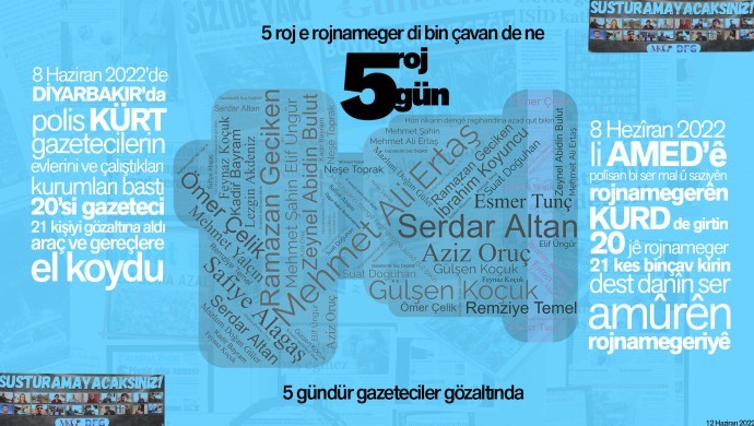 AMED – Amed’te 8 Haziran’da evlerine ve çalıştıkları yapım şirketleri ile ajanslara yapılan baskın sonucu rehin alınan 20’si gazeteci 21 kişi halen işkalci İl Emniyet Müdürlüğü’nde tutuluyor. İki defa ek rehin alınma süreleri verilen gazeteciler, dün adliyeye çıkarılarak mahkeme kararıyla rehin alınma süreleri 4 gün daha uzatıldı. Ek rehin alınma süresiyle birlikte gazeteciler, 16 Haziran’a kadar emniyette tutulabilecek. Birçoğu tekli hücrede tutulan gazetecilerin dosyalarındaki kısıtlılık kararı ise sürüyor.
