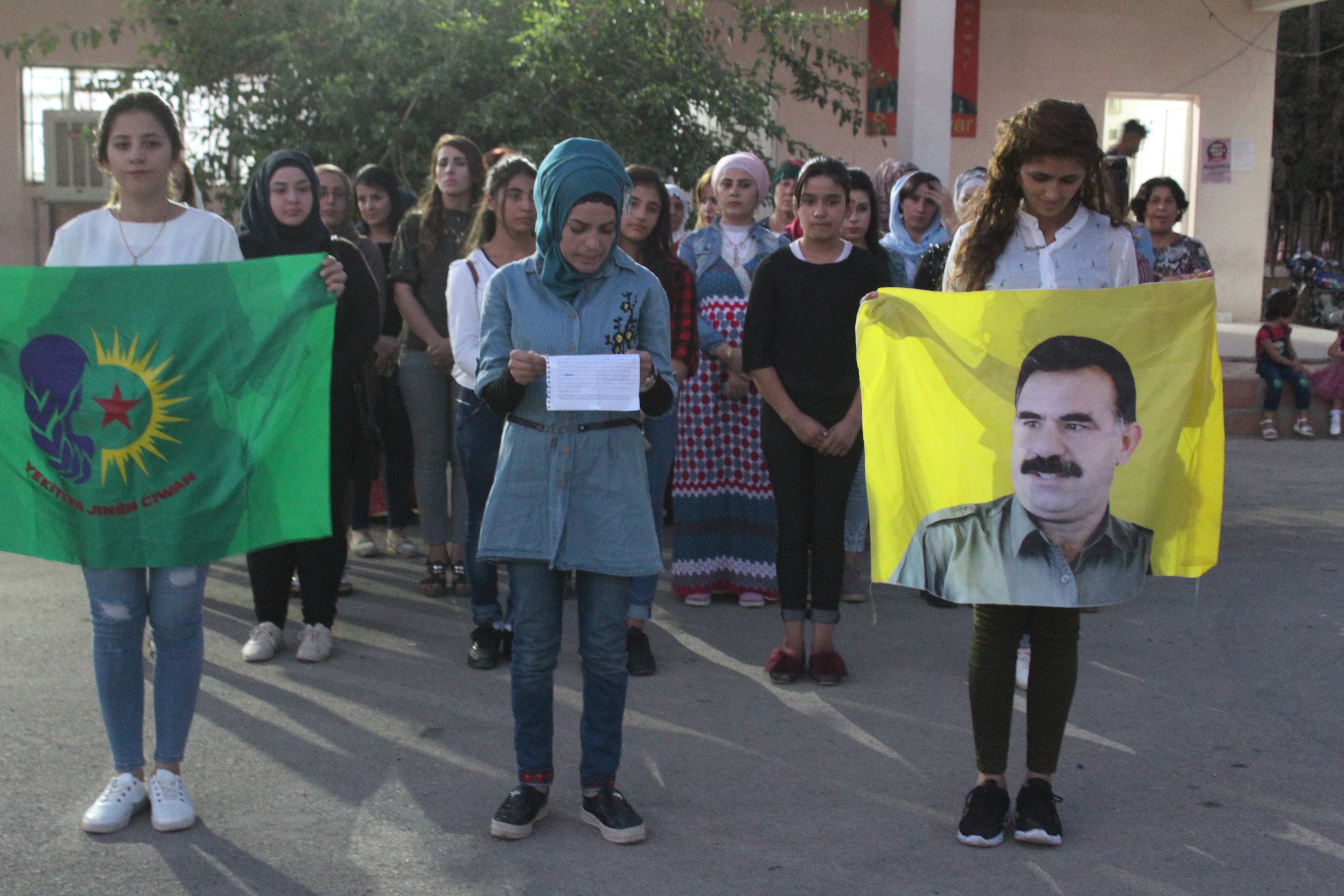 DERİK – Genç Kadın Birliği (YCR) tarafından gerçekleştirilen basın açıklaması ile işgalci Türk devletinin Efrîn ve Güney Kürdistan’a yönelik işgal saldırıları protesto edildi. Rojava Gençlik Birliği’ne bağlı Şehit Bawer Merkezi önünde gerçekleştirilen açıklamaya, çok sayıda kadın katıldı.