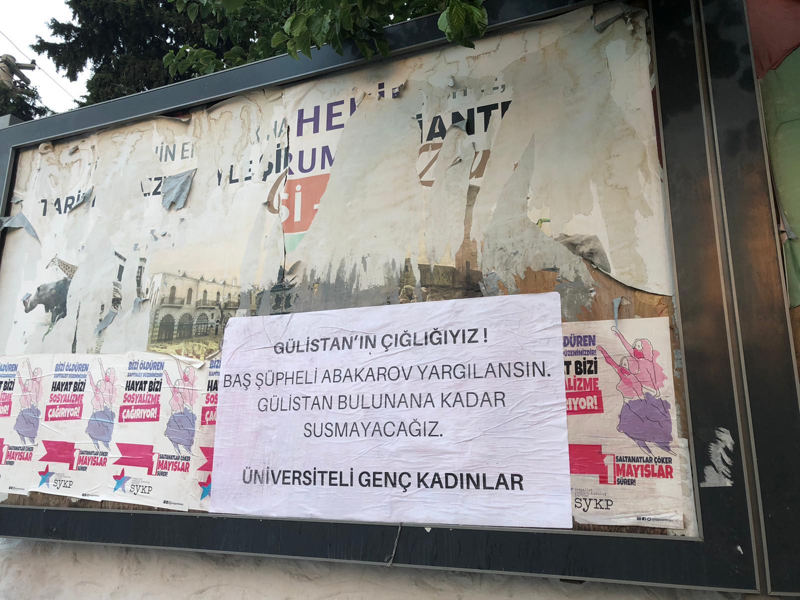 İzmir’in Buca ilçesinde Üniversiteli Kadınlar, 152 gündür kayıp olan ve haber alınamayan Gülistan Doku’ya dikkat çekmek için “Gülistan’ın Çığlıyız! Baş şüpheli Abakarov yargılansın. Gülistan bulunana kadar susmayacağız!” yazılı bir pankart astılar.