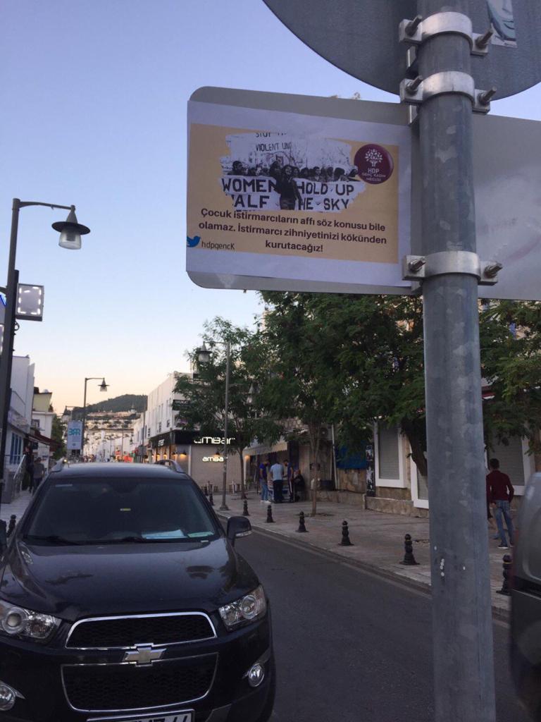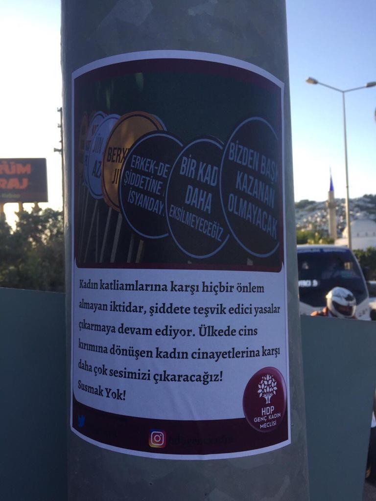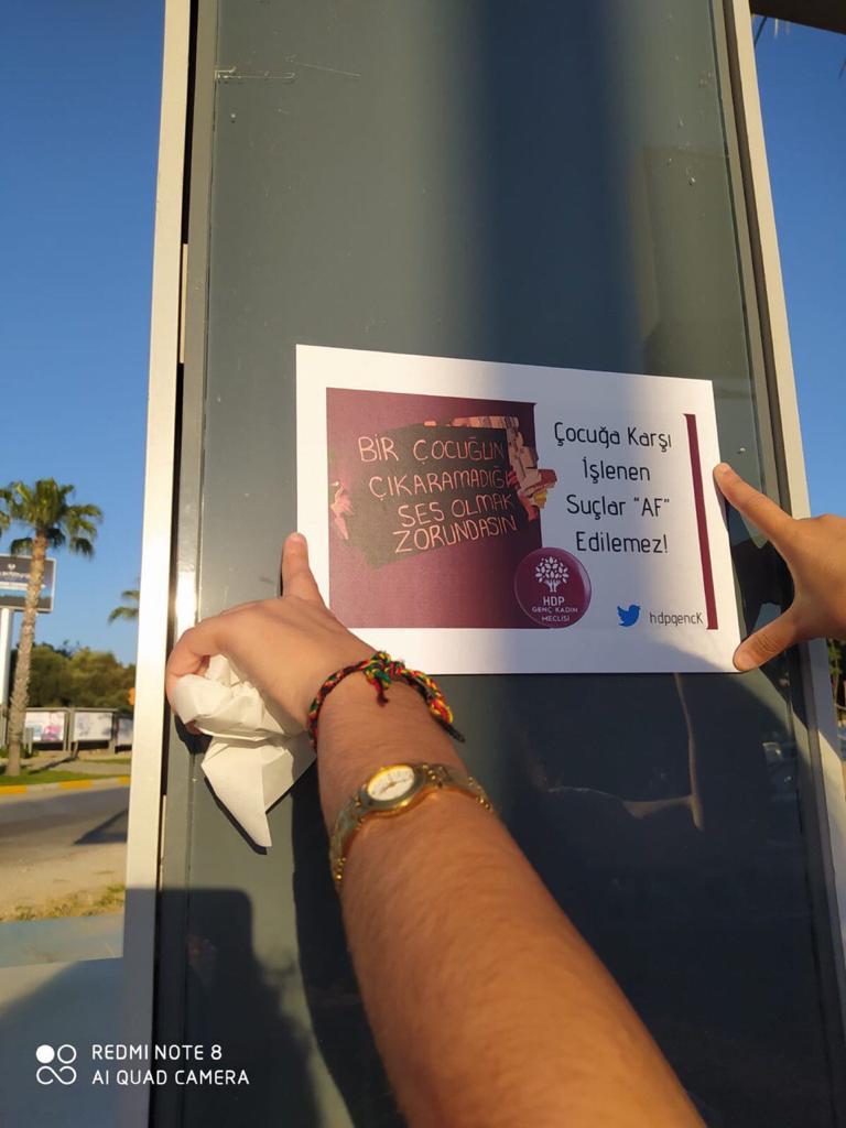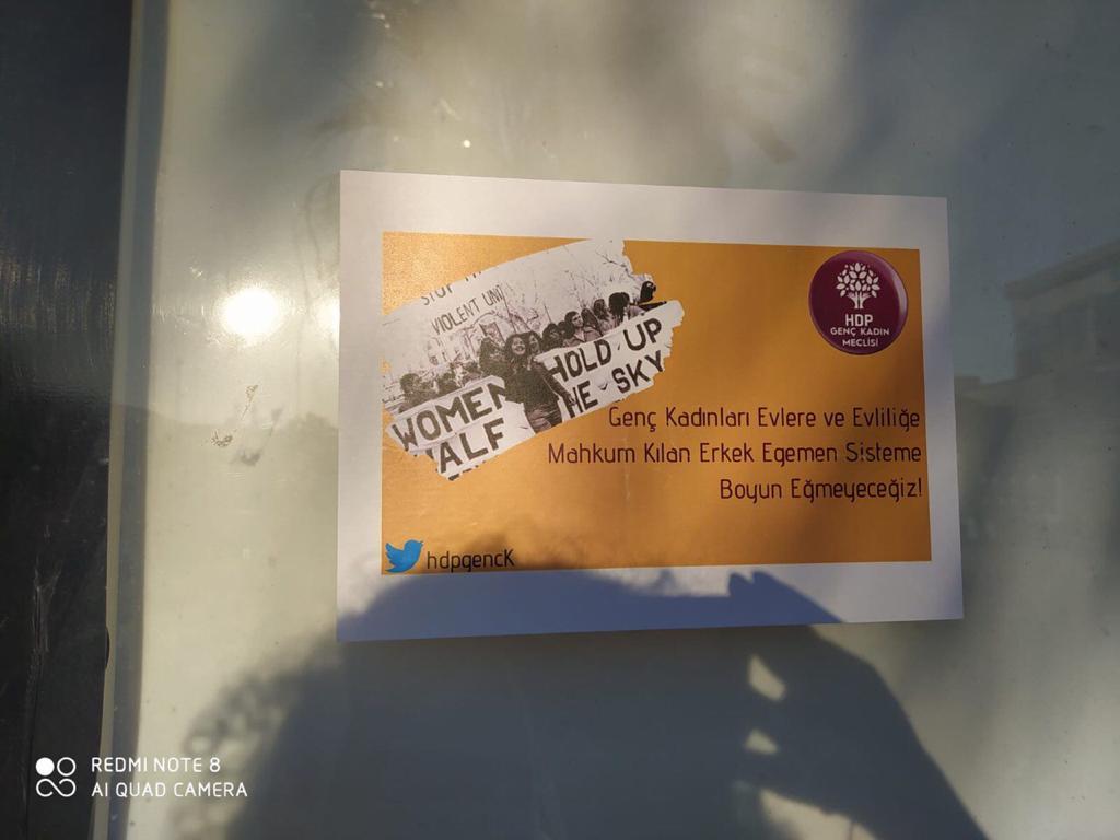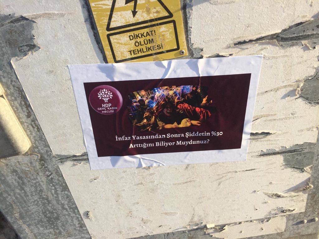 HDP Genç Kadın Meclisi ise kadınlara yönelik gelişen şiddet ve tecavüze karşı sticker eylemi gerçekleştiler. Özellikle infaz yasasından sonra artan şiddet ve tecavüze dikkat çeken genç kadınlar, ‘İnfaz yasasından sonra şiddetin %30 artığını biliyor muydunuz?’, ‘her türlü kaosun iktidarın katleden olmayacağız’, ‘genç kadınlar iktidarın politikalarına boyun eğmeyecek’, ‘bir çocuğun çıkaramadığı ses olmak zorundasın’, ‘çocuğa karşı işlenen suç af edilemez’, ‘çocuk katliamlarına karşı hiçbir önlem alamayan iktidar şiddete teşvik edecek yasalar çıkarmaya devam ediyor’, ‘Ülkede cins kırımına dönüşen kadın katliamlarına karşı daha çok sesimizi çıkaracağız susmak yok!’ yazılı stickerları şehrin sokak ve caddelerine yapıştırdılar.