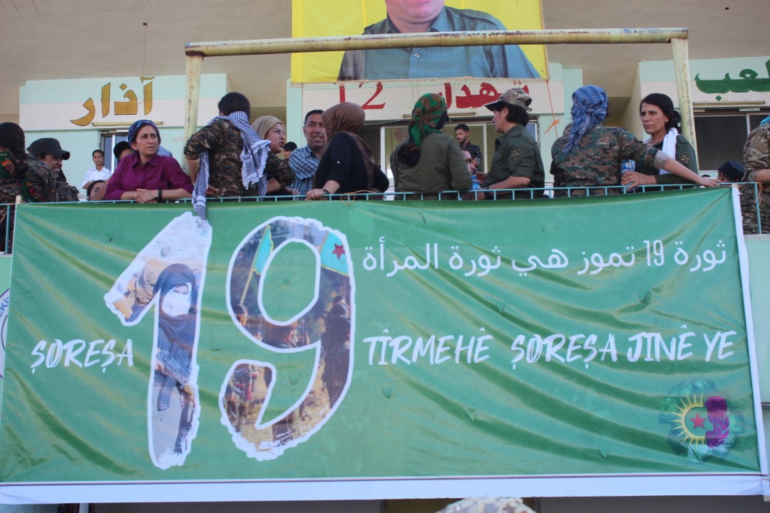 QAMIŞLO- Cizre Bölgesi’nden farklı halk ve inançlardan binler, Rojava Devrimi’nin 7’nci yıldönümünü kutlamak amacıyla genç kadın öncülüğünde Qamişlo’da bir araya geldi. Kutlamanın gerçekleştirildiği Siyahi Mahallesi’nde bulunan 12 Mart Şehitleri Stadyumu, Halklar Önderi Abdullah Öcalan ve şehitlerin posterleri, YPG/YPJ bayrakları ve “Özgür gençler demokratik özgür yaşamın garantisidir”, “19 Temmuz Devrimi genç kadınların kültür ve özgürlük okyanusudur” ve “Halkımızın birliğiyle Erdoğan faşizmini yok edeceğiz” yazılı pankartlar ile donatıldı.