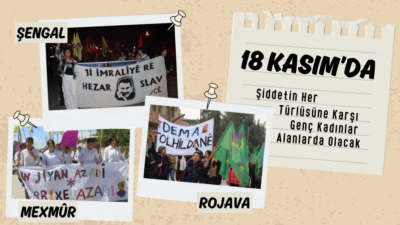 HABER MERKEZİ- Kadına yönelik şiddete karşı mücadele günü olan 25 Kasım vesilesiyle Genç Kadınlar Kürdistan’ın bir çok merkezinde kitlesel yürüyüşler düzenliyor. Genç kadınlar 18 Kasım’da Mexmur, Şengal ve Rojava’da alanlarda toplanarak kadına yönelik şiddet ve katliamlara karşı İmralı Önder APO şahsında yürütülen direnişi ruhuyla yürüyecek. Bir yıl önce duyurusu yapılan “Jin Jiyan Azadi Serbixe Azadi” kampanyası kapsamında genç kadınlar sahalara akın edecek ve şiddetin her türlüsüne karşı mücadelesini yükseltecek.