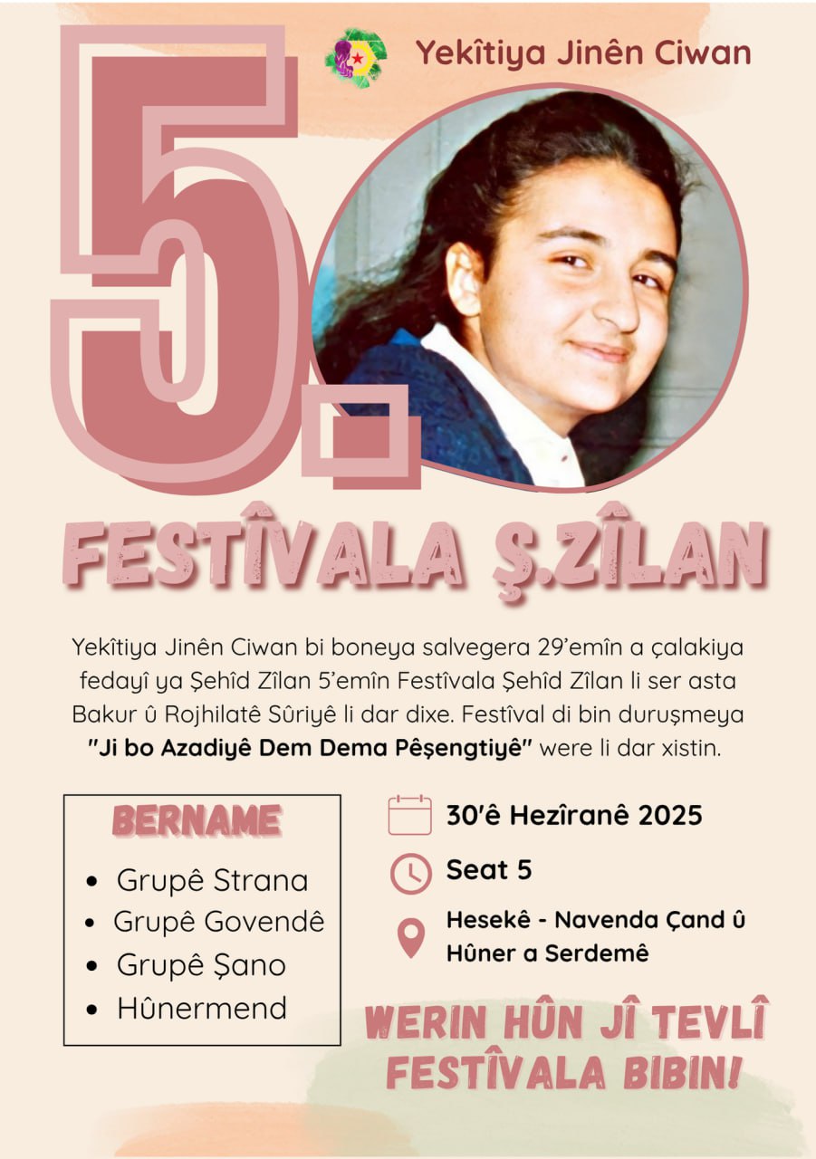 HABER MERKEZİ- Genç Kadınlar Birliği, Şehit Zilan’ın fedai eyleminin 29. yıldönümü vesilesiyle Kuzey ve Doğu Suriye’de 5. Şehit Zilan Festivali’ni düzenliyor. Festival “Özgürlük İçin Öncülük Zamanı” hamlesi çerçevesinde düzenlenecek.