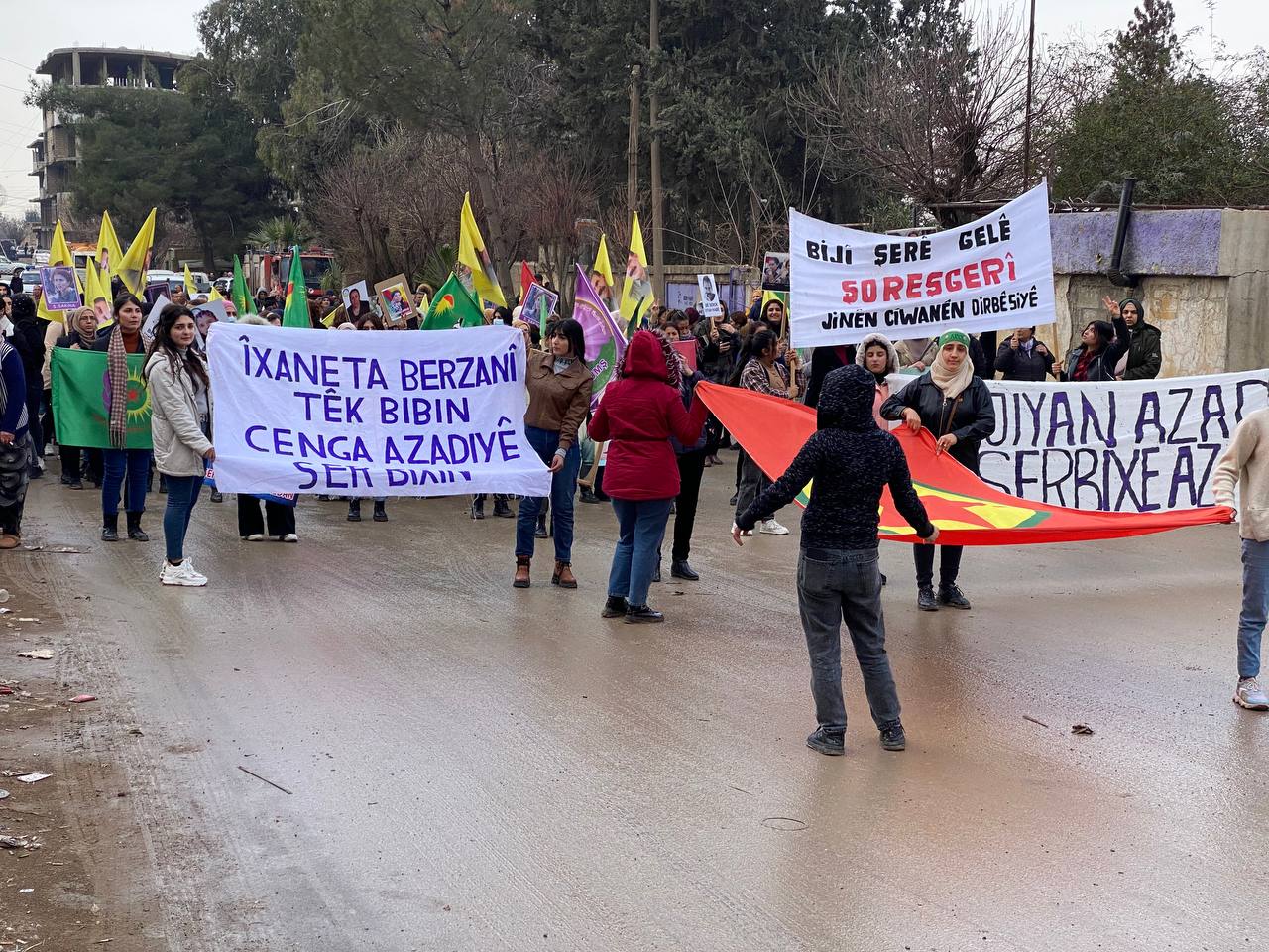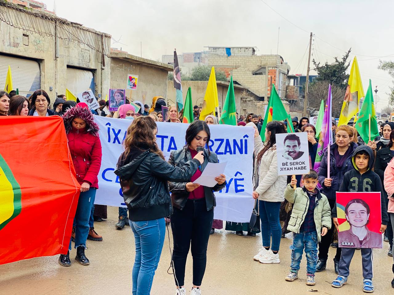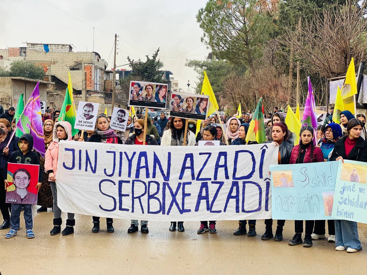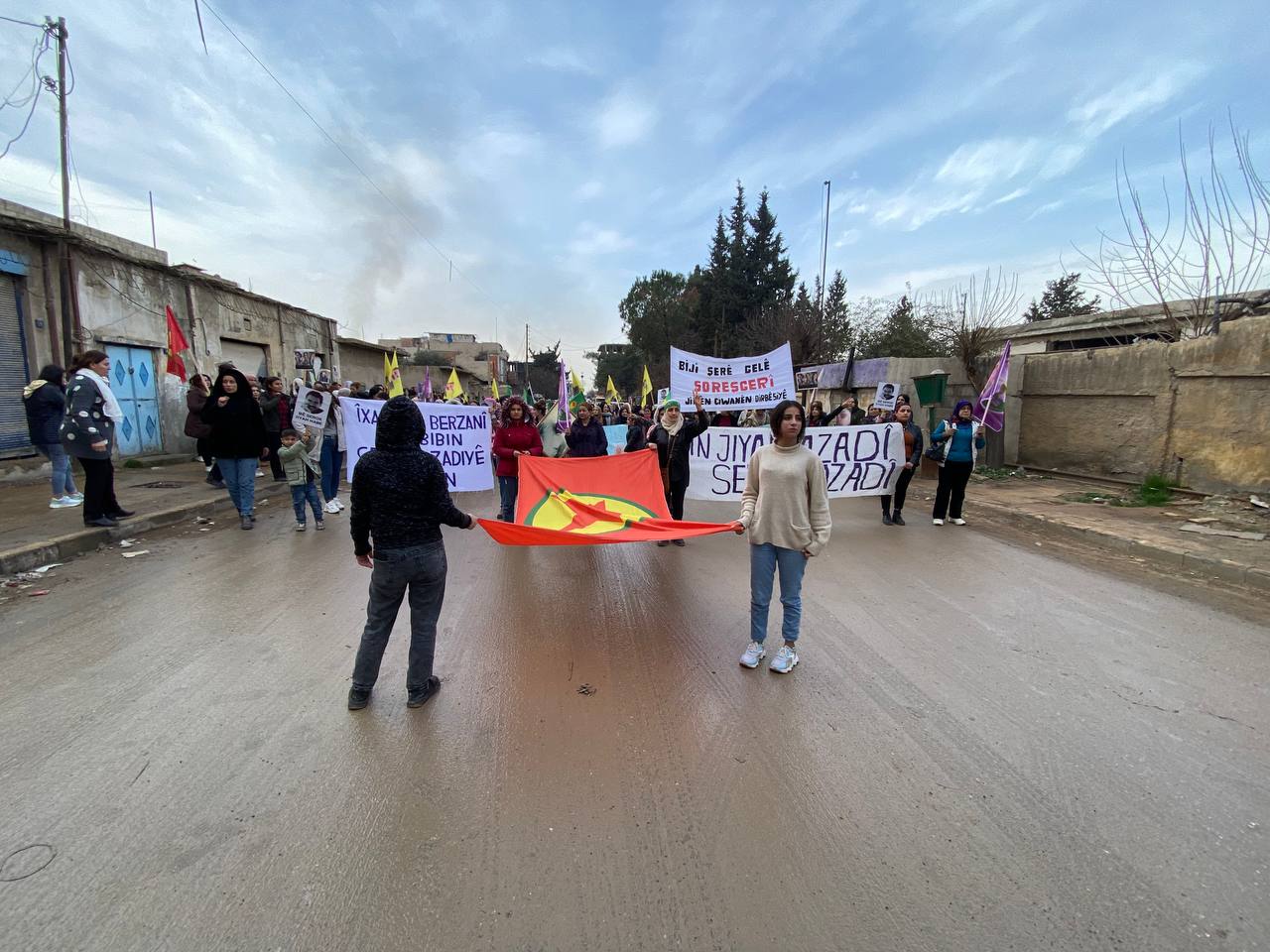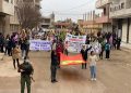 DIRBESIYÊ – Bugün Hesekê’ye bağlı Dirbesiyê ilçesinde Genç Kadınlar Birliği öncülüğünde ve bölge halkı sakinlerinin katılımıyla Kekük’te süikast sonucu şehit edilen devrimci Zelal Zagros’un faşist, soykırımcı Türk devleti ve onun hain ortağı PDK tarafından şehit edilmesini kınamak için yürüyüş yapıldı. Hac Sultan Camii’nden başlayan yürüyüş, Kongra Star Merkezi’ne kadar devam etti. Yürüyüş boyunca “Bimre İxanet, Bimre Dagirkeri, Bê Serok Jiyan Nabe sloganlarıyla genç kadınlar, düşmanın devrimin öncülerine yönelik katletme girişimine karşı tavırlarını dile getirdiler.