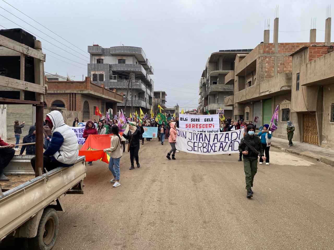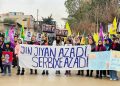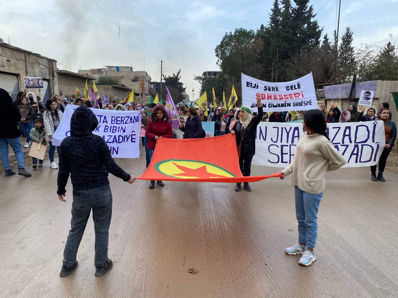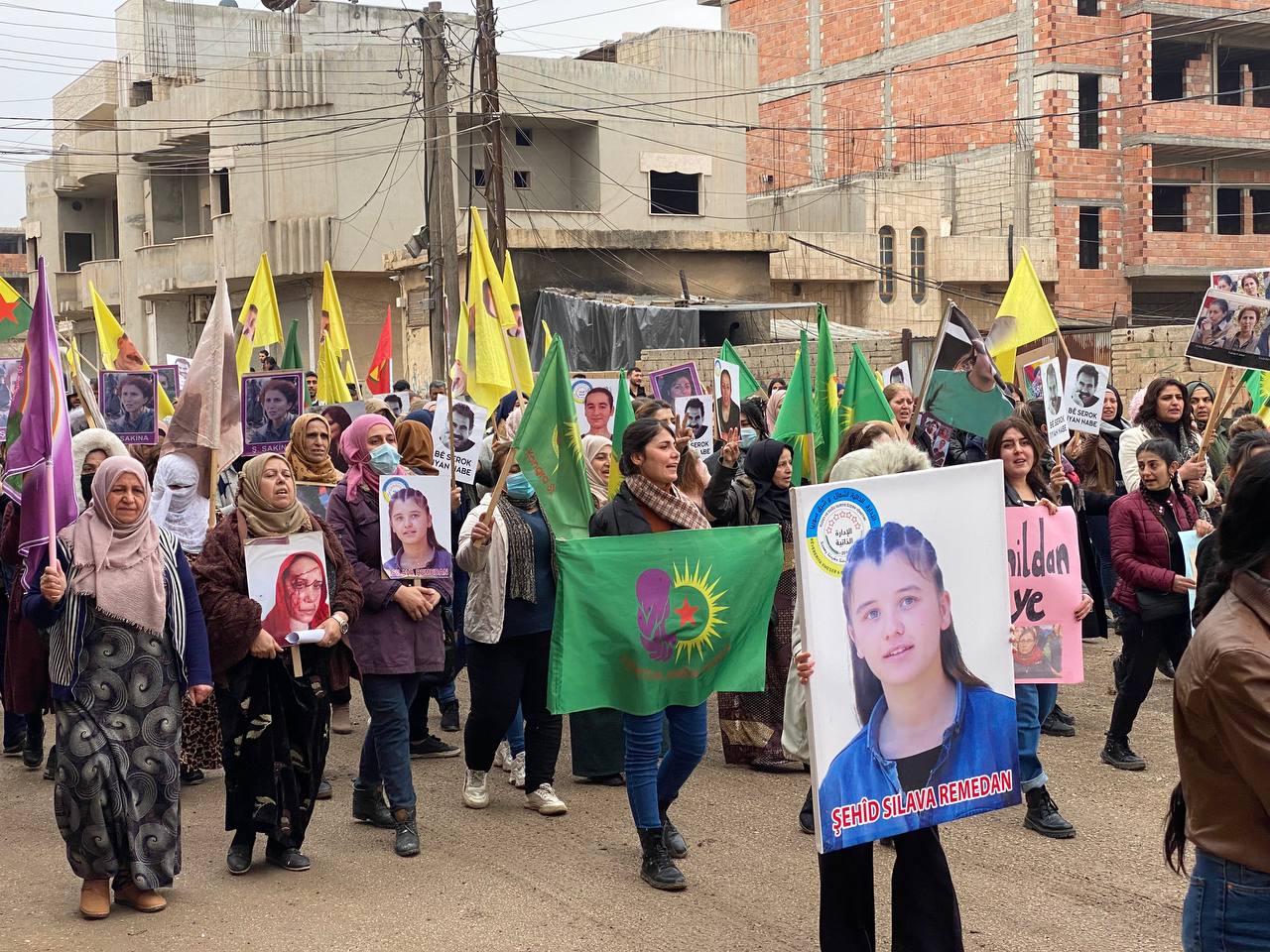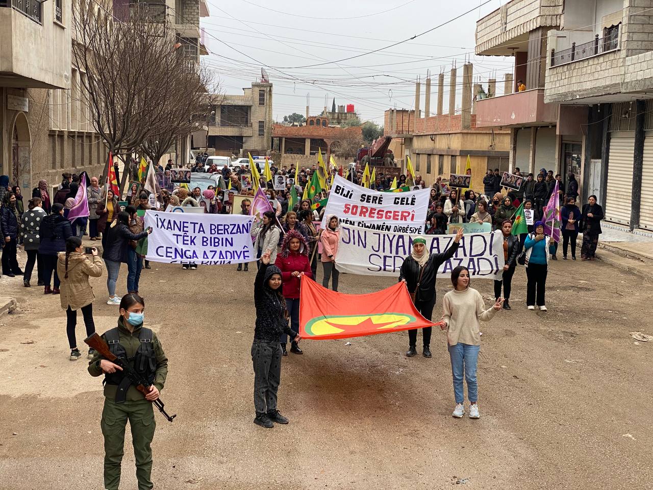 DIRBESIYÊ – Bugün Hesekê’ye bağlı Dirbesiyê ilçesinde Genç Kadınlar Birliği öncülüğünde ve bölge halkı sakinlerinin katılımıyla Kekük’te süikast sonucu şehit edilen devrimci Zelal Zagros’un faşist, soykırımcı Türk devleti ve onun hain ortağı PDK tarafından şehit edilmesini kınamak için yürüyüş yapıldı. Hac Sultan Camii’nden başlayan yürüyüş, Kongra Star Merkezi’ne kadar devam etti. Yürüyüş boyunca “Bimre İxanet, Bimre Dagirkeri, Bê Serok Jiyan Nabe sloganlarıyla genç kadınlar, düşmanın devrimin öncülerine yönelik katletme girişimine karşı tavırlarını dile getirdiler.