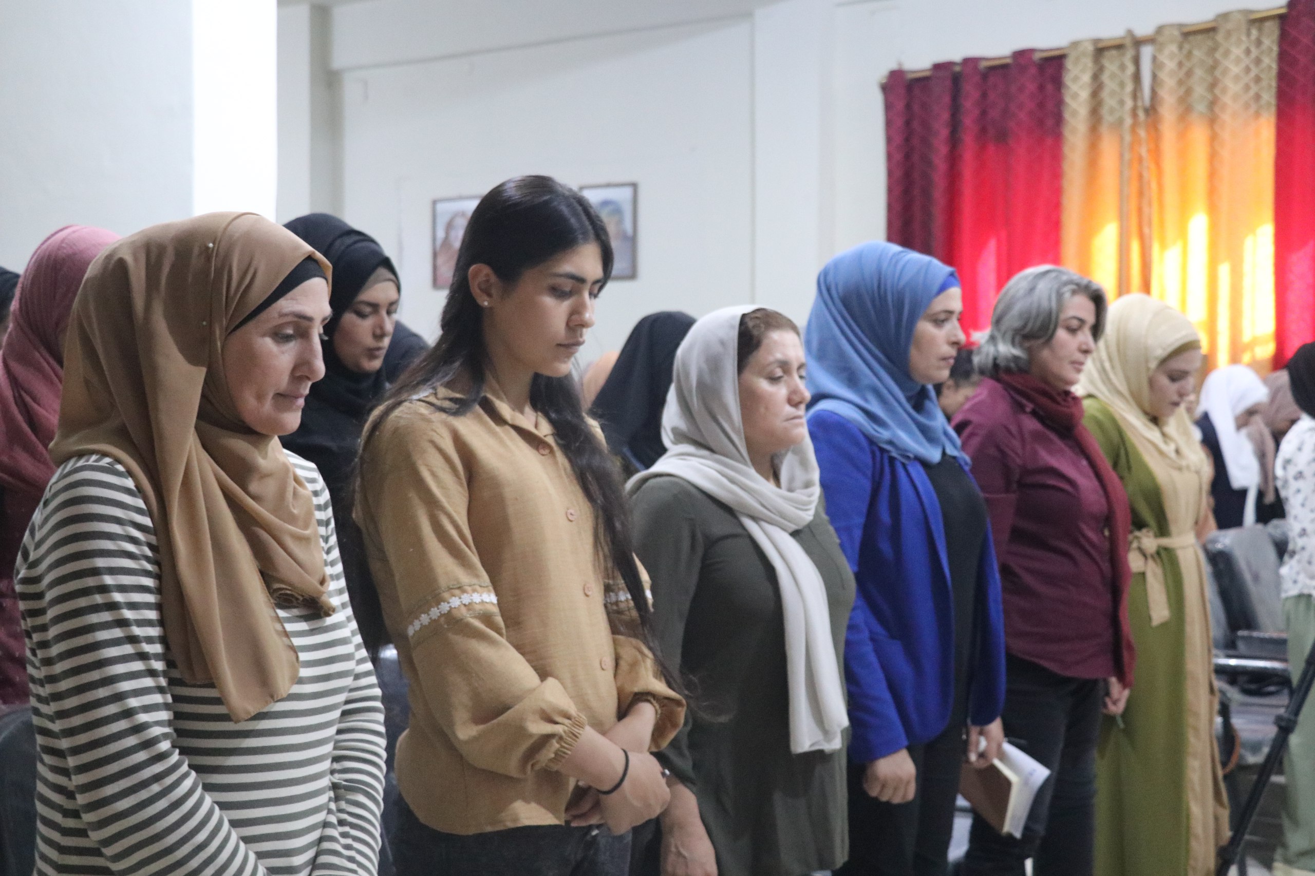 Genç Kadın Birliği çalıştaya başlamadan önce devrim şehitlerinin ruhları için bir dakikalık saygı duruşunda bulundu ve ardından Genç Kadın üyesi Sarah El-Ibrahim günün anlam ve önemine dönük Önderlik değerlendirmesini okudu.