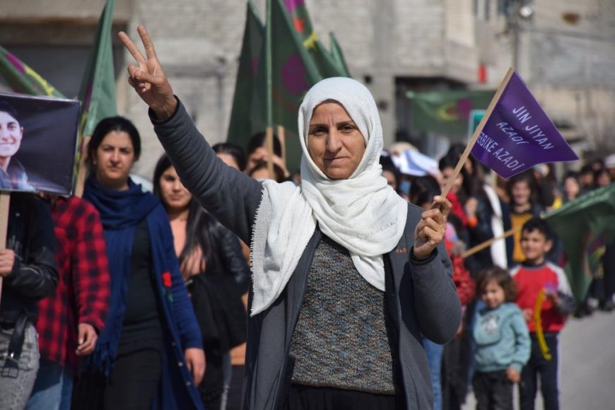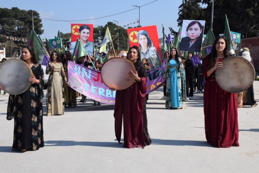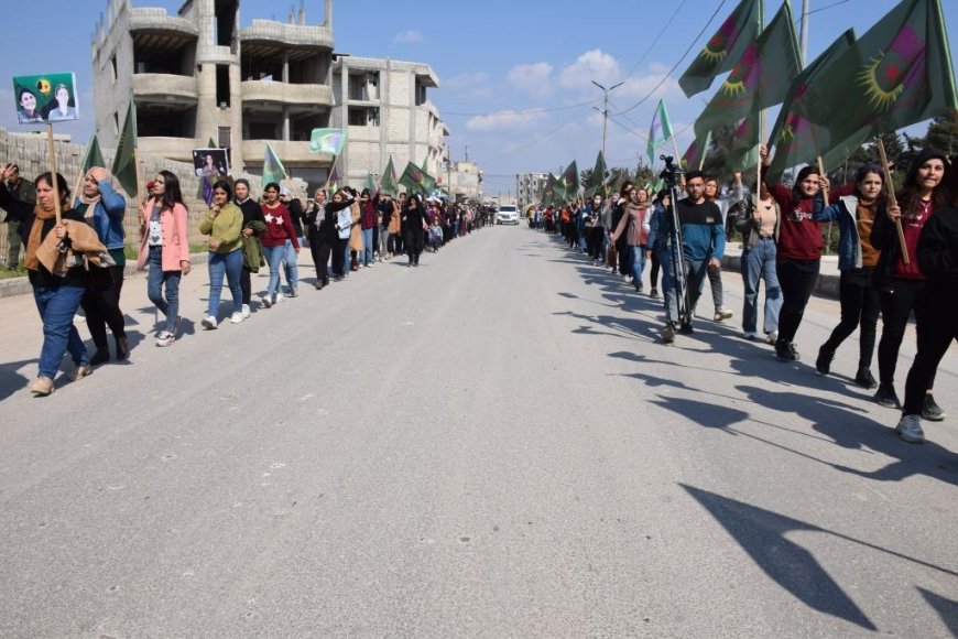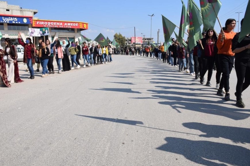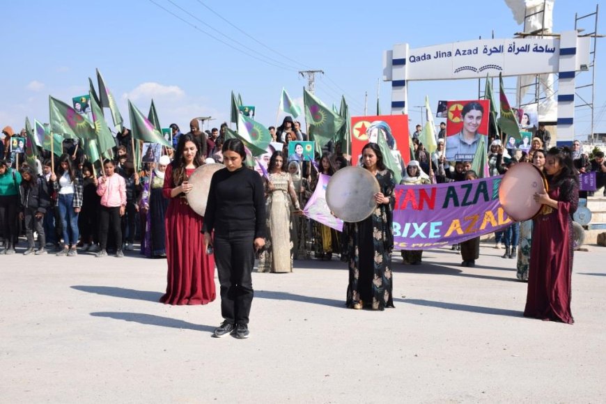 HABER MERKEZİ- Kuzey ve Doğu Suriye’de “Özgür kadın iradesiyle, soykırım, işgal ve tecrit politikalarını boşa çıkaracağız” şiarıyla düzenlenen 8 Mart eylemleri devam ediyor. Genç Kadınlar Birliği’nin 8 Mart vesilesiyle düzenlediği yürüyüşe onlarca kadın geleneksel kıyafetleriyle katıldı.