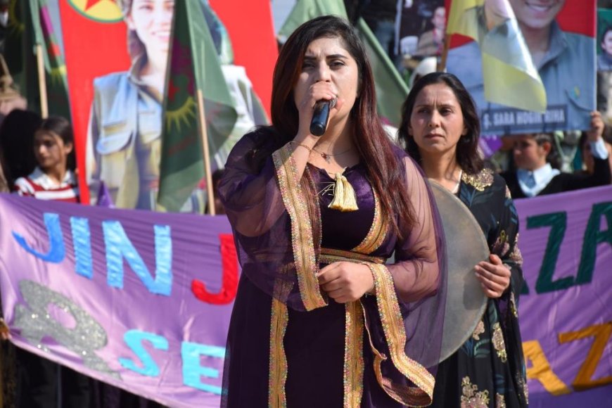 Özgür Kadın Meydanı’nda konuşma yapan Genç Kadınlar Birliği Sözcüsü Neda Şahîn, “Başta özgürlük için özgür dağlarda mücadele eden kadınlar olmak üzere tüm dünya kadınlarının bugününü kutluyoruz. Her zaman kadınların haklarını yok etmek istediler, ancak her zaman şiddete, tecavüze ve katliamlara karşı özgürlük yolunu tutacağız. Bu düzeye Önder Apo ve öncü kadınlar sayesinde ulaştık” diye konuştu.