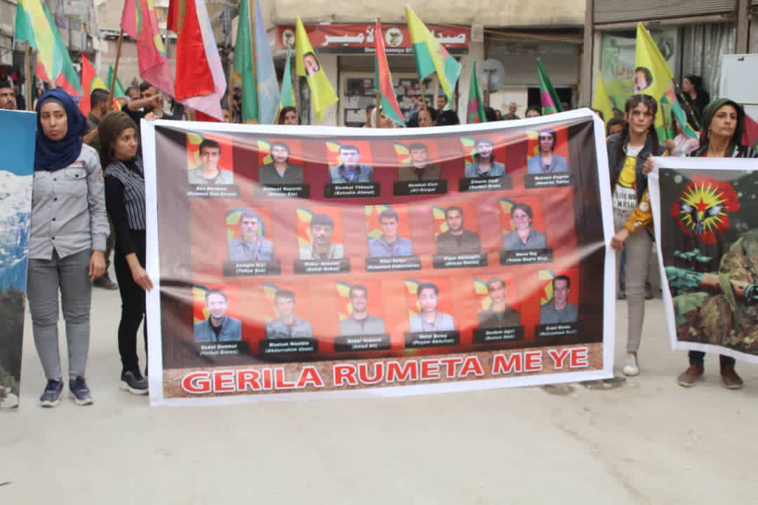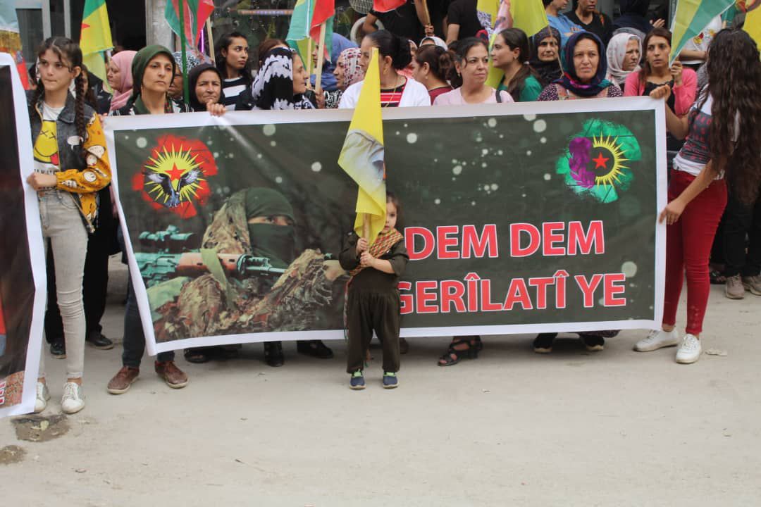 Halep’te ise halk ve mahallede bulunan tüm genç kadınların katılımıyla başlayan yürüyüş, Xerbi mahallesinden şehidi alanına, Şerq mahallesi ile Efrîn mahallesine kadar devam ederek sona erdi.