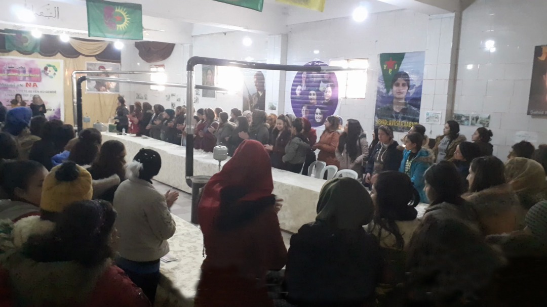 Salon Halklar Önderi Abdullah Öcalan, şehit resimleri, Genç Kadınlar Birliği bayrakları ve “Kadın özgür yaşar”, “Genç kadın ayaklanması intikamdır” ve “Rojava Direnişi insanlığın direnişidir. Koruyun” yazılı pankartlarla süslendi.