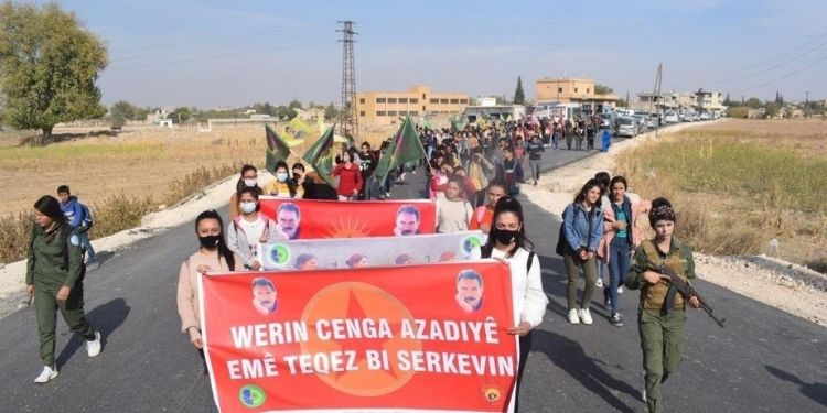 İlçe meclis binası önünde başlayan yürüyüşte sık sık “Yaşasın gerilla direnişi”, “Faşist Türk devletine hayır” ve “Bê serok jiyan nabê” sloganları atıldı.