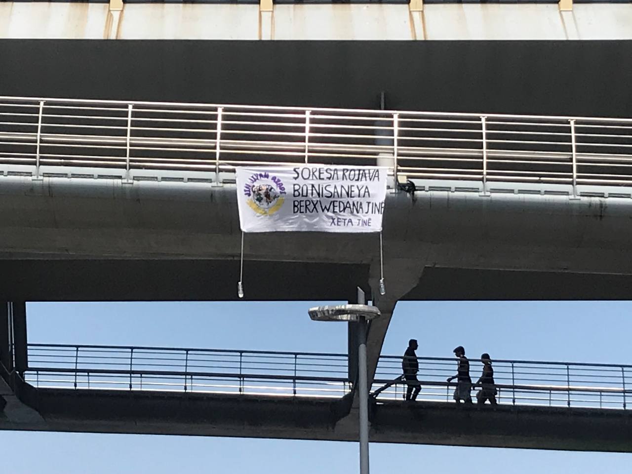 İSTANBUL- Özel savaşa, kadın katliamlarına, tecavüze, asimilasyon politikalarına ve işgalciliğe karşı ‘Xeta Jinê’ etrafında örgütlenen genç kadınlar bugün 19 Temmuz Rojava Devriminin 12. yıldönümü vesilesiyle İstanbul’un en işlek caddelerindeki bir geçide pankart astı.
