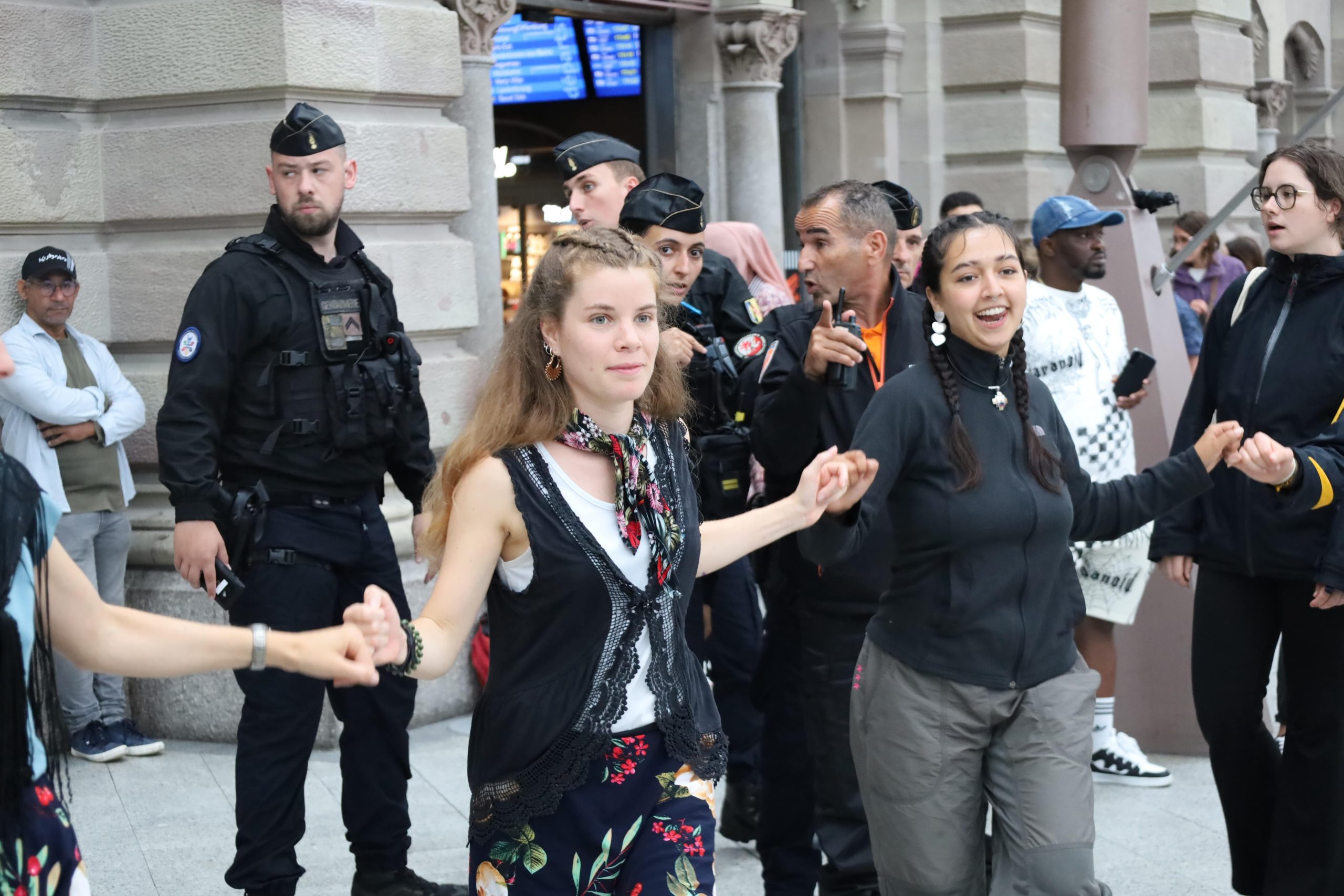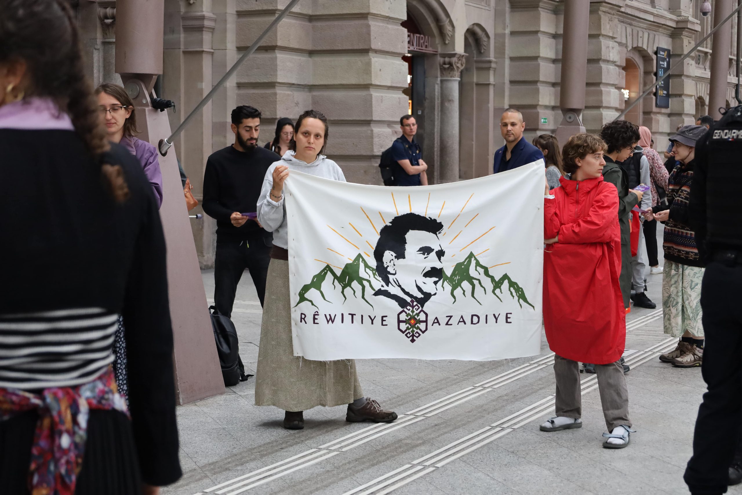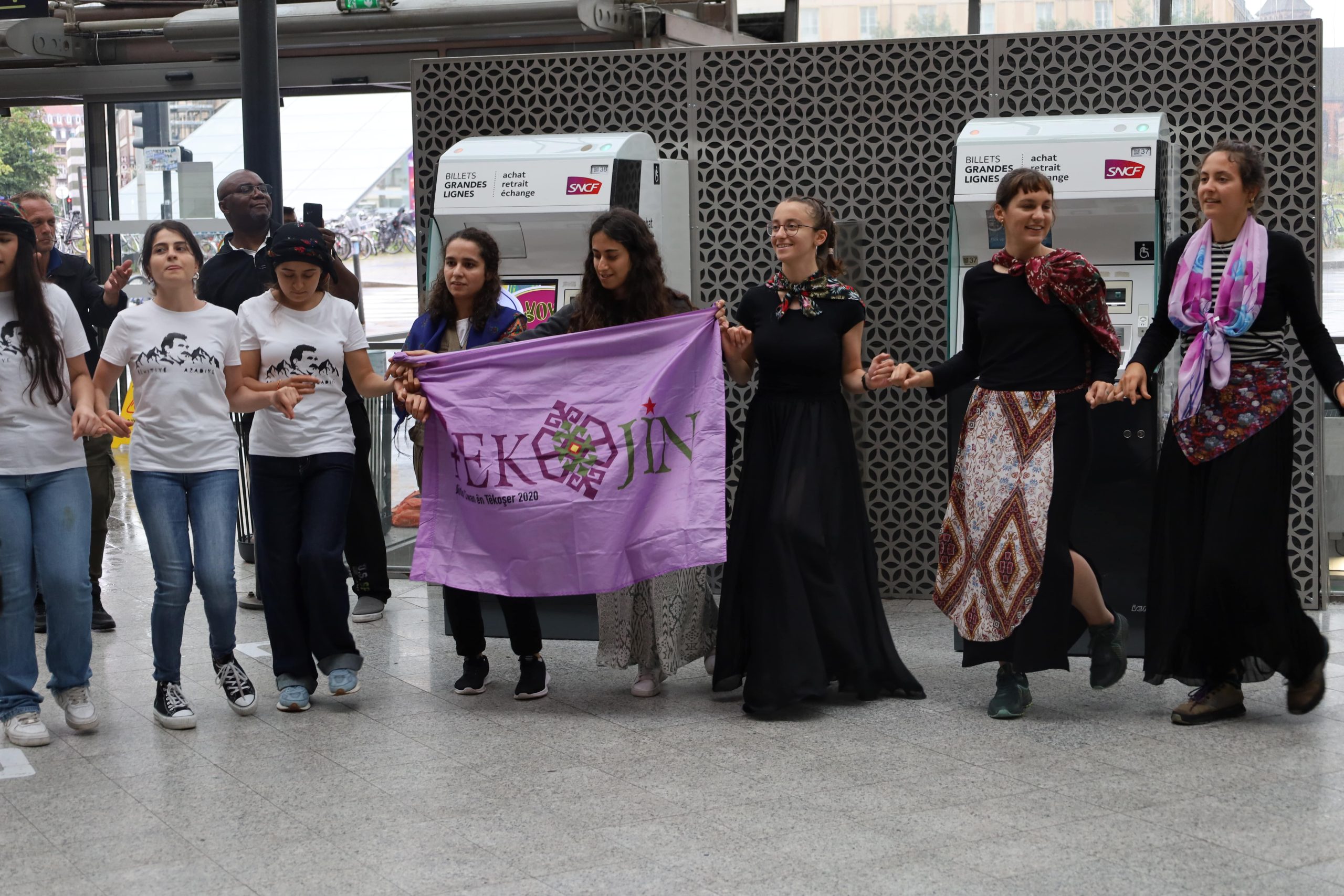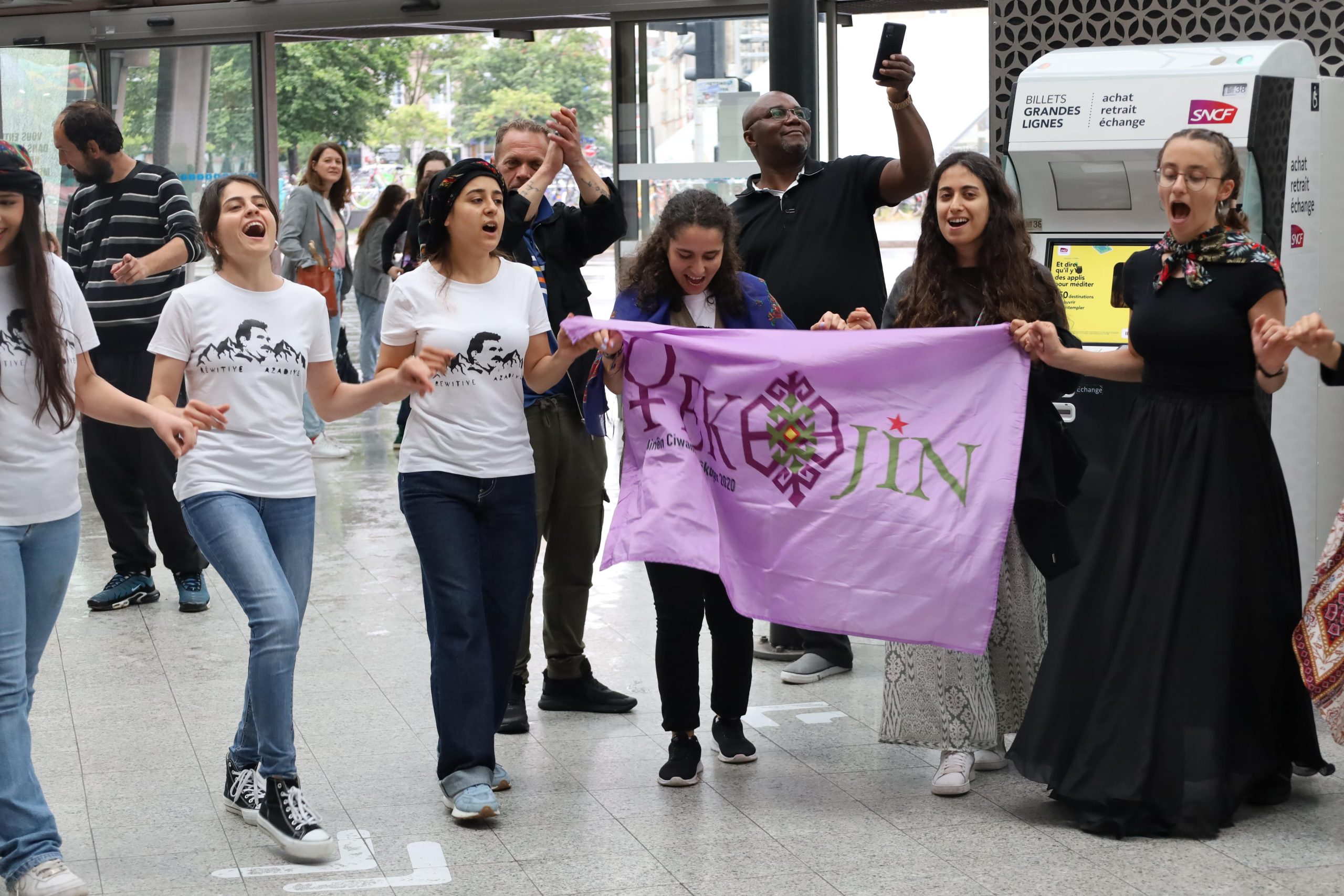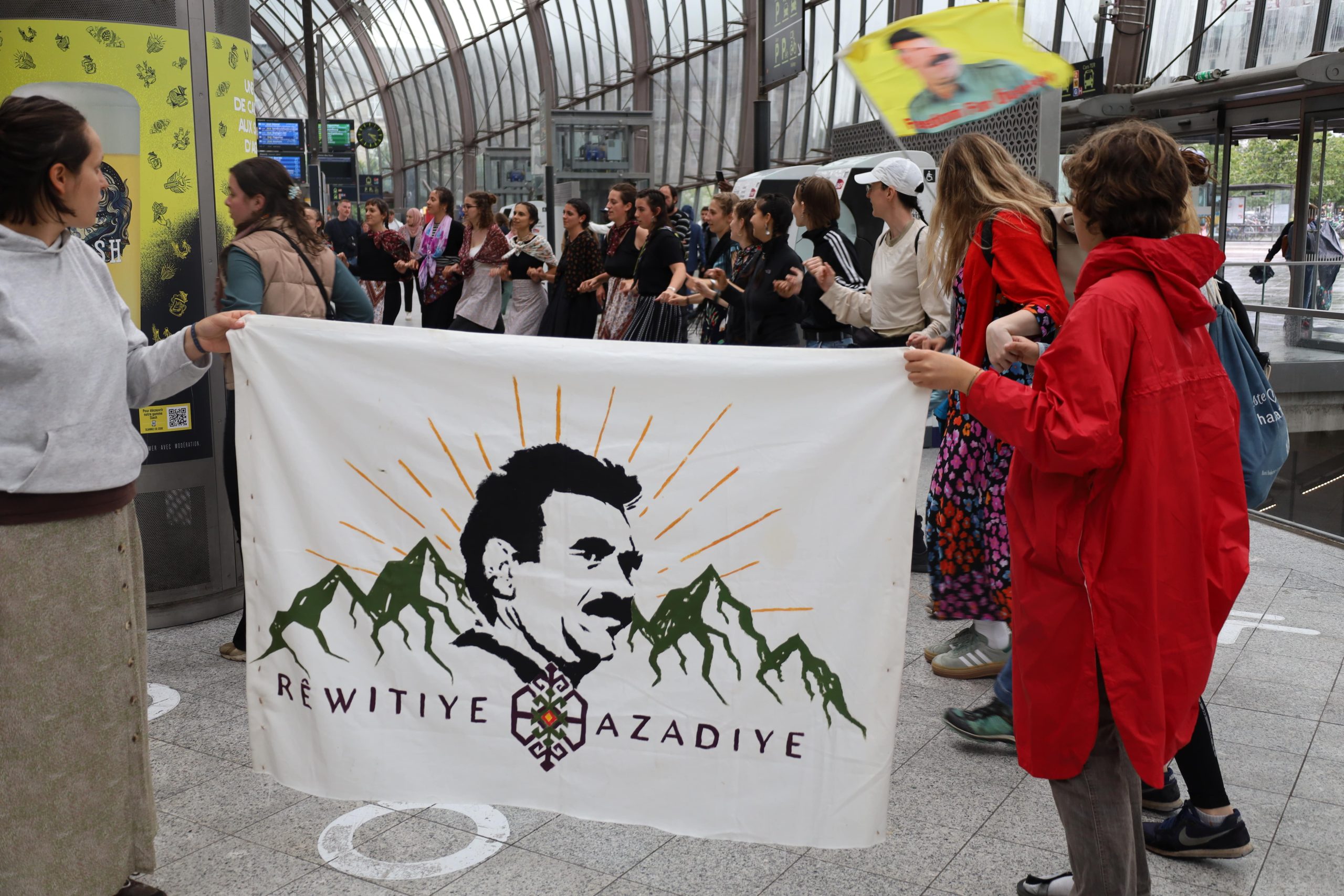 Strasbourg Merkez Tren İstasyonu içinde sivil itaatsizlik eylemi gerçekleştiren genç kadınlar Önder APO’nun özgürlüğünü haykırdı.