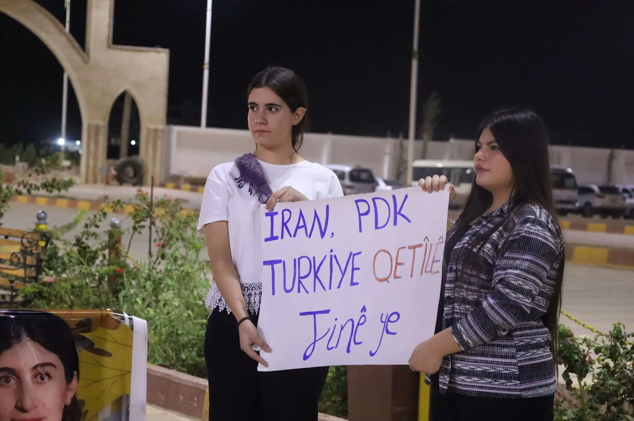 Sonunda genç kadınlar Farsça, Türkçe, Arapça, Kürtçe ve İngilizce dillerinde “Jin Jiyan Azadî Serbixe Azadî” sloganını attı.