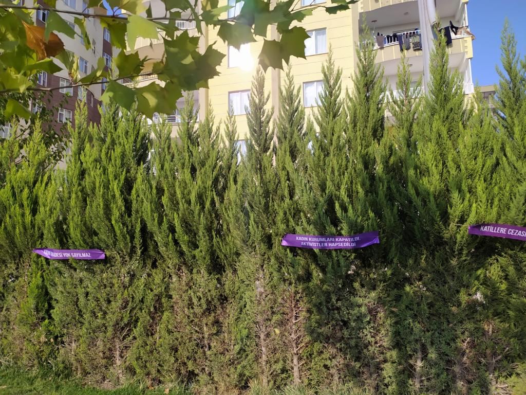 HDP Genç Kadın Koordisnasyonluğu astığı mor kurdelerde şu sloganlar kullanıldı; 6284’ü uygula, İstanbul sözleşmesi hayat kurtarır, İstanbul sözleşmesini uygula, Kadın iradesi yok sayılamaz, Yaşasın kadın dayanışmamız, Haziran ayında 27 Kadın katledildi, Kadın derneklerine erkek müdür atandı, Kadın kurumları kapatıldı, aktivistler hapsedildi, Kayyım eşbaşkanlığı hedef aldı, 2019‘da 474 Kadın katledildi, Katil en yakınlarımız, Katili ve zihniyetini tanıyoruz, Katillere cezasızlık şiddeti arttırıyor, Pandemi de erkek şiddeti %27,8 arttı, Genç kadınlar egemen akla boyun eğmeyecek.