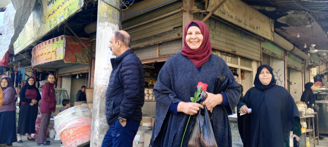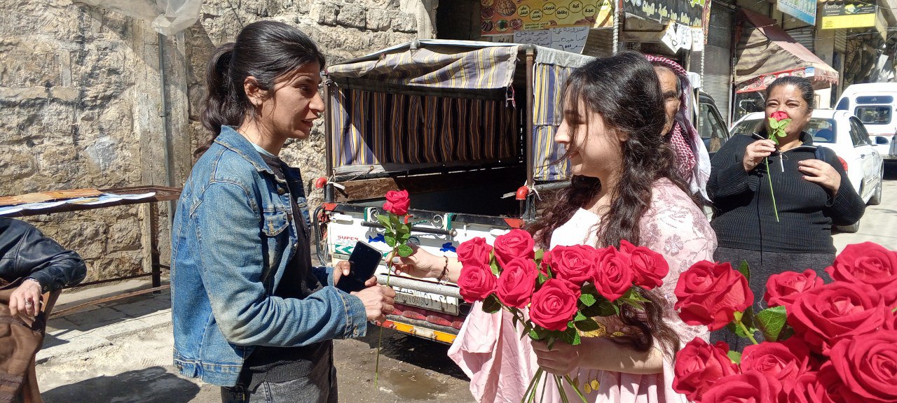 Genç kadınlar Şexmaxsûd mahallesinde kadınlara gül dağıttı