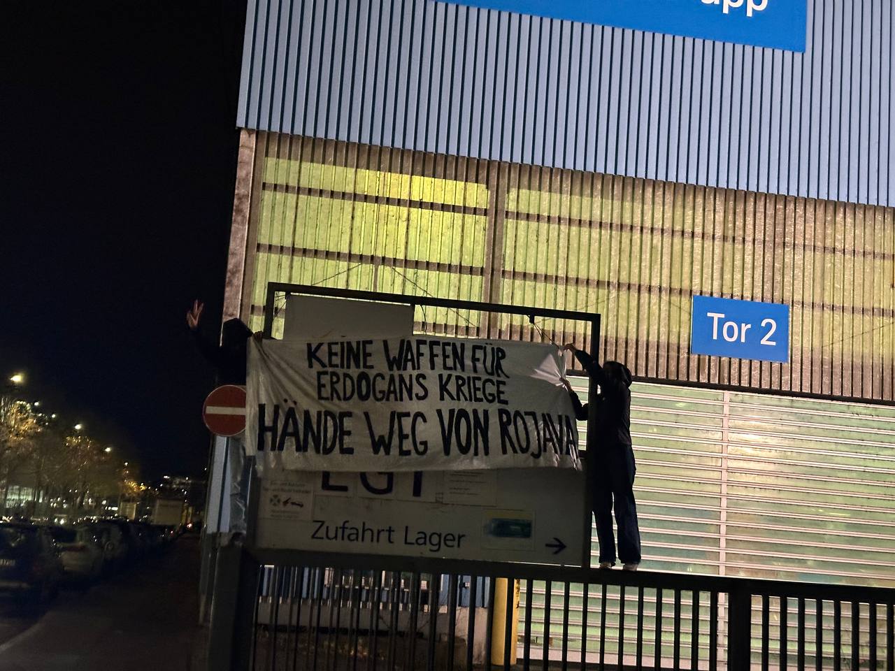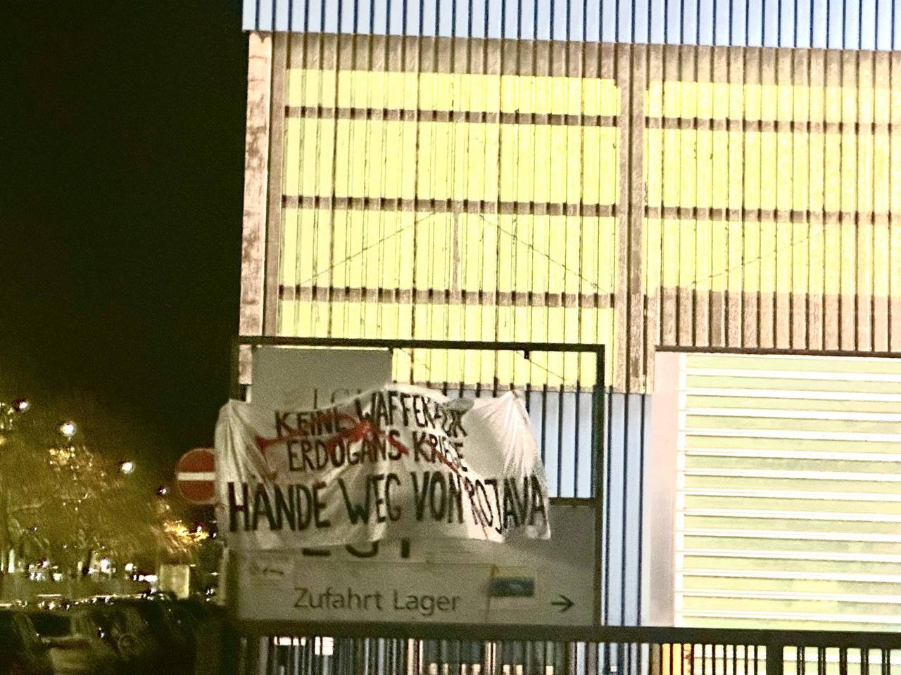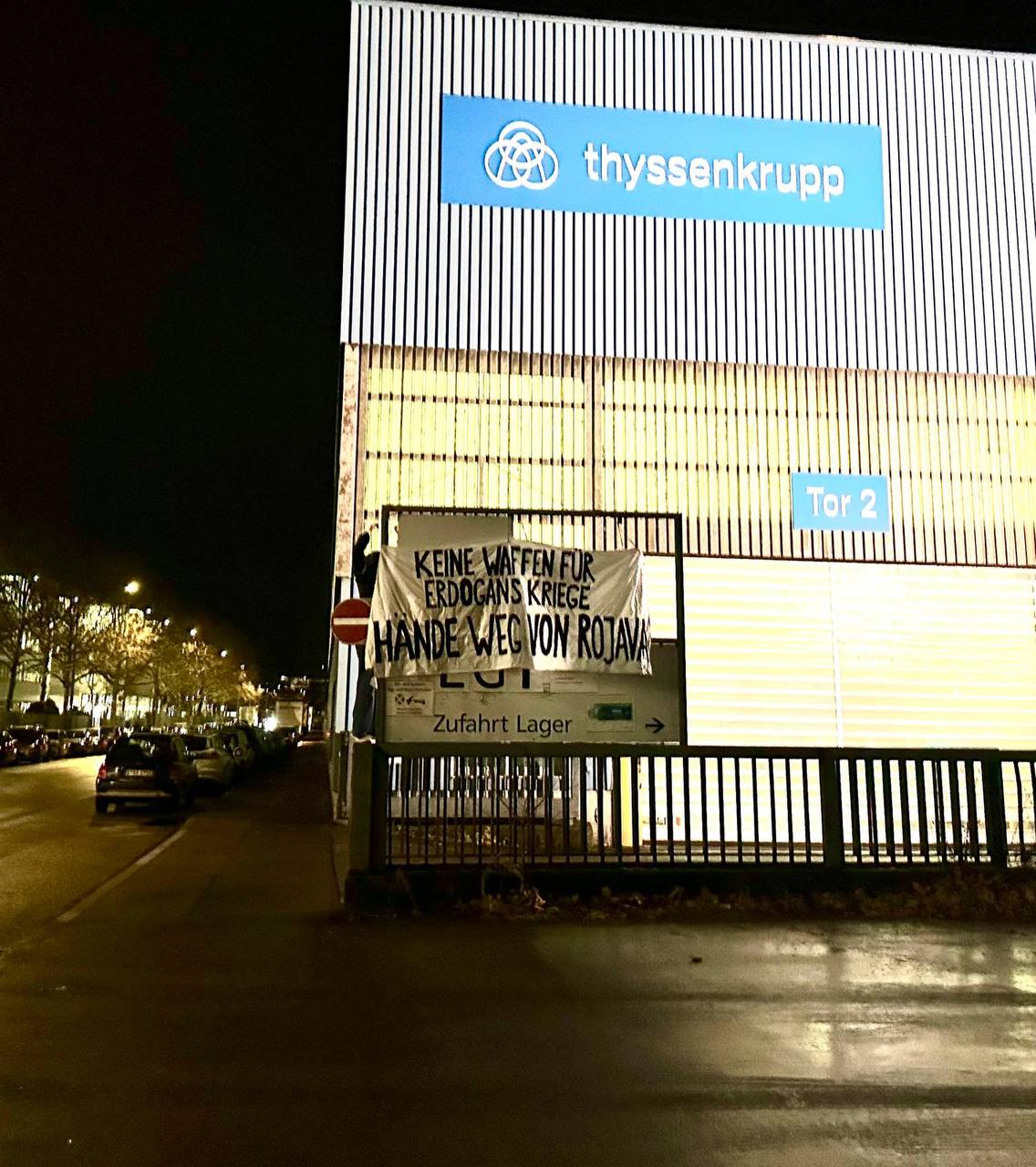 Faşist Türk devleti ile iş birliği içeresinde olan ThyssenKrupp silah şirketinin güvenlik tel örgüsüne “Keine Waffen für Erdogans kriege Hände weg von Rojava” (Erdoğan’a Silah yok, Rojava’dan çekilin” yazılı pankart asan genç kadınlar, Rojava saldırılarında ThyssenKrupp silah şirketinin sorumlu olduğuna dikkat çekti.