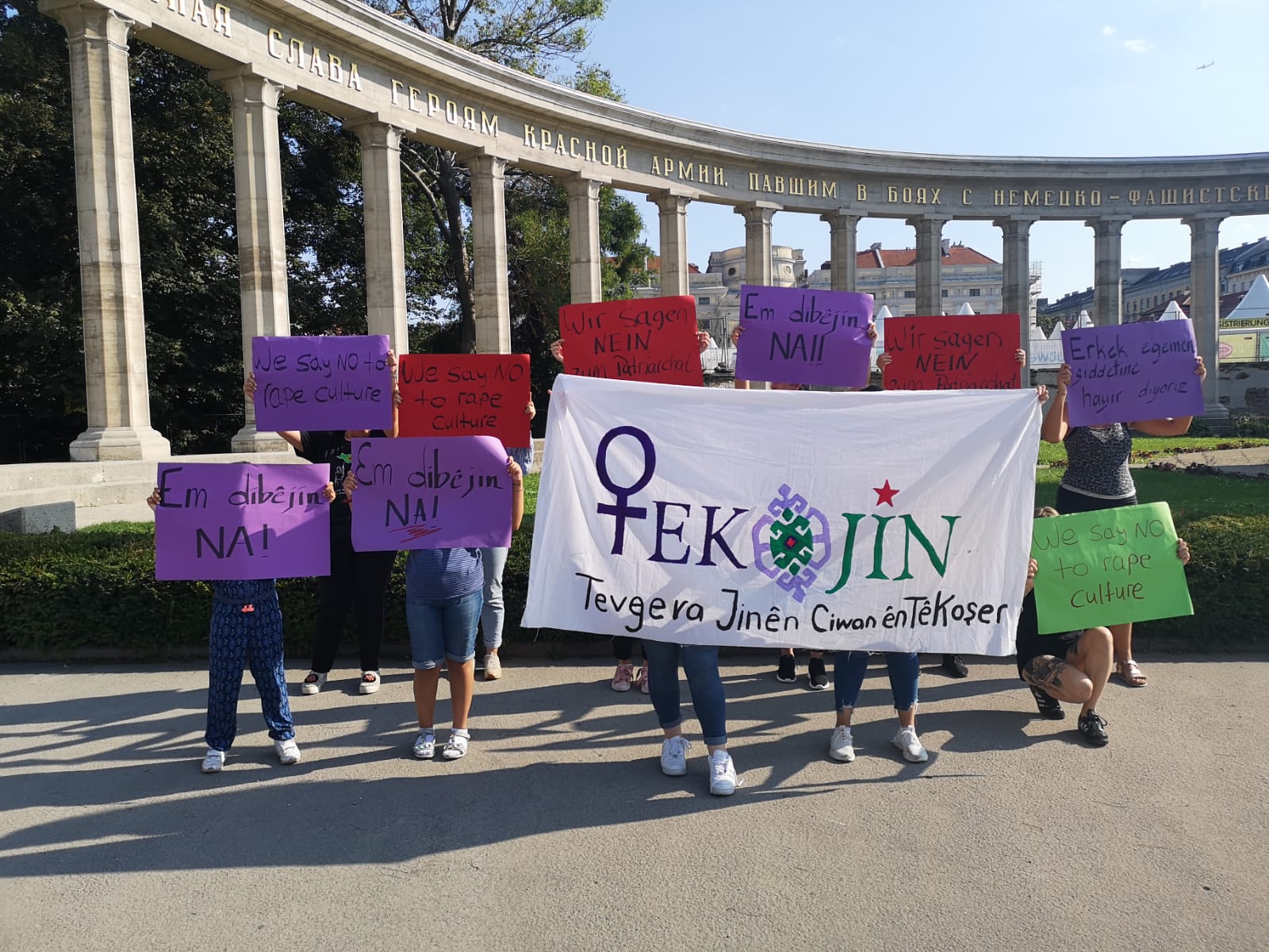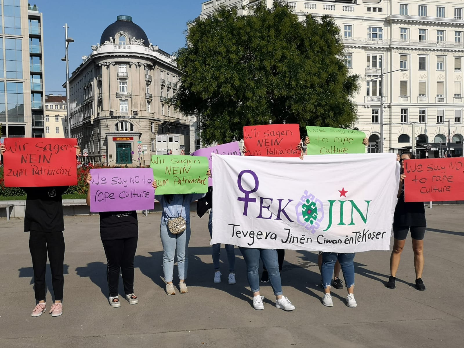 Başûrê Kurdistan’da ilan edilen ‘Em dibêjin NA’ kampanyası yayılmaya devam ediyor. Kampanya bu sefer Viyana’da TEKO-JIN aktivistleri ve enternasyonalist genç kadınlar tarafından selamlandı. Kampanyayı selamlayan genç kadınlar, Türkçe ve Almanca “Erkek egemen şiddetine hayır diyoruz”, “Em dibêjin NA” ve İngilizce “Tecavüz kültürüne hayır diyoruz” yazılı pankartlar tuttu.