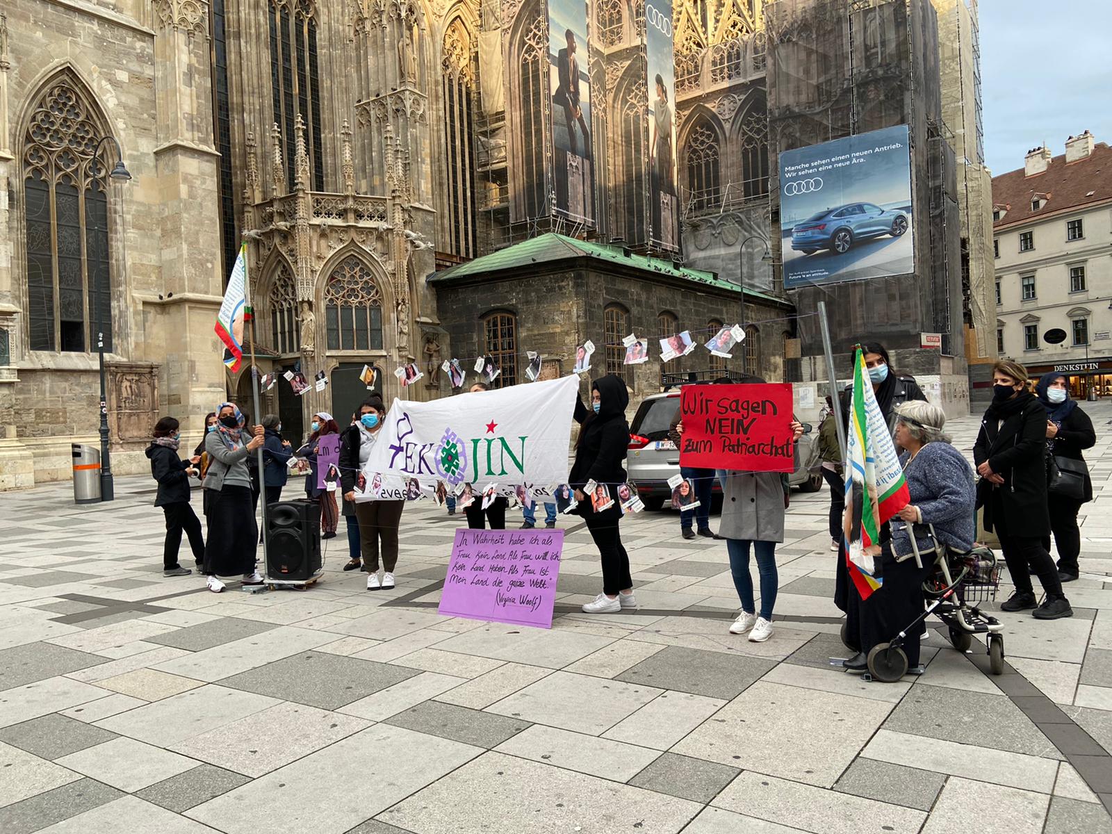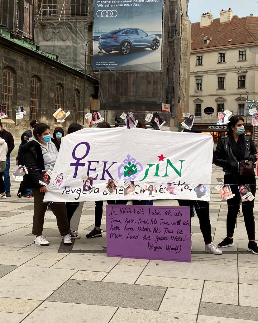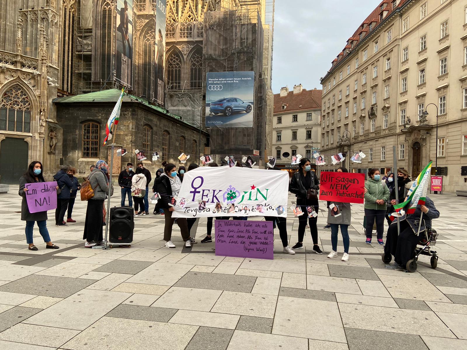 VİYANA – Dünya çapınca yükselişe geçen kadın kırımına dikkat çekmek isteyen TEKO-JIN aktivisti genç kadınlar, Avusturya’nın başkenti Viyana’da bir eylem düzenledi.
