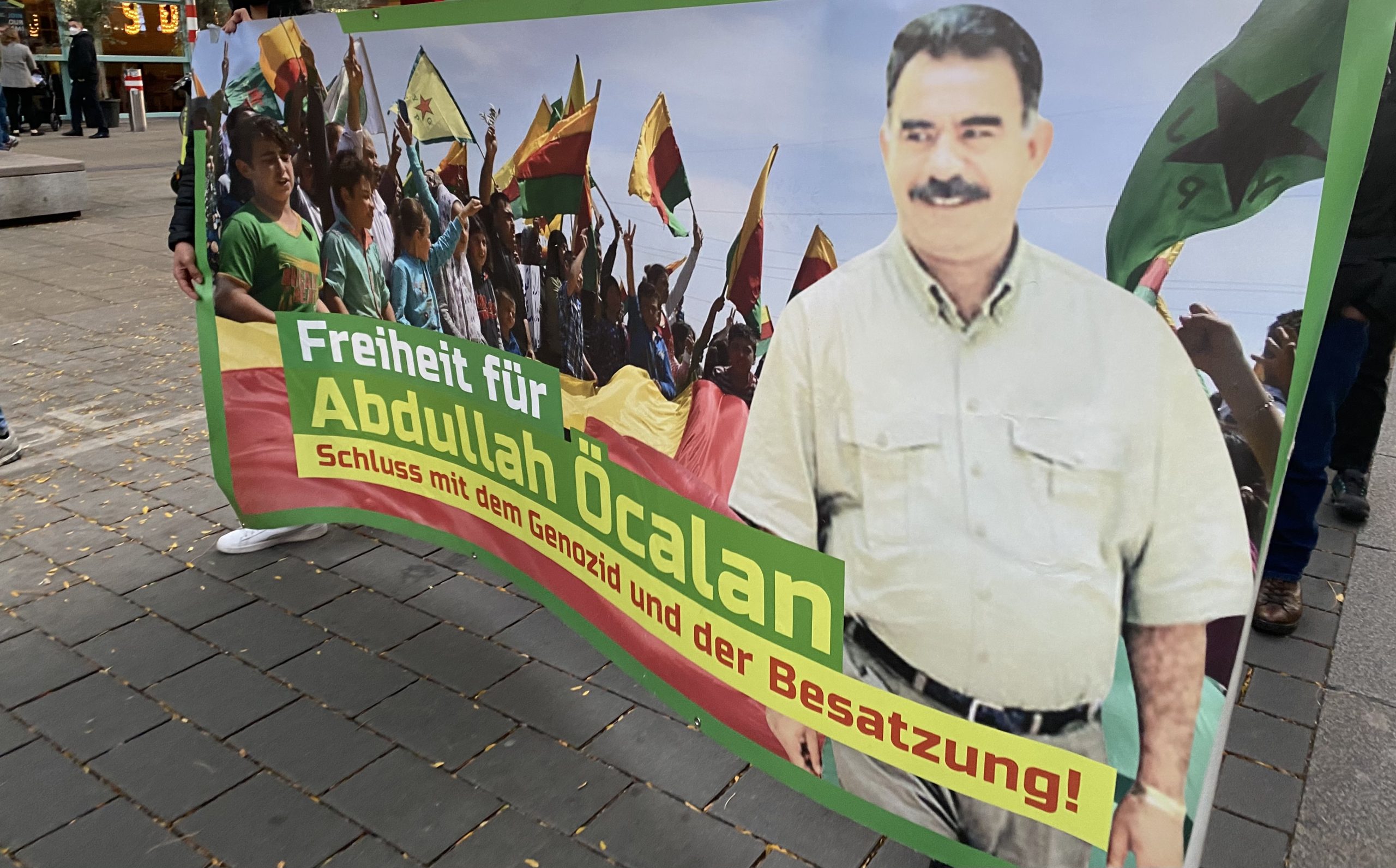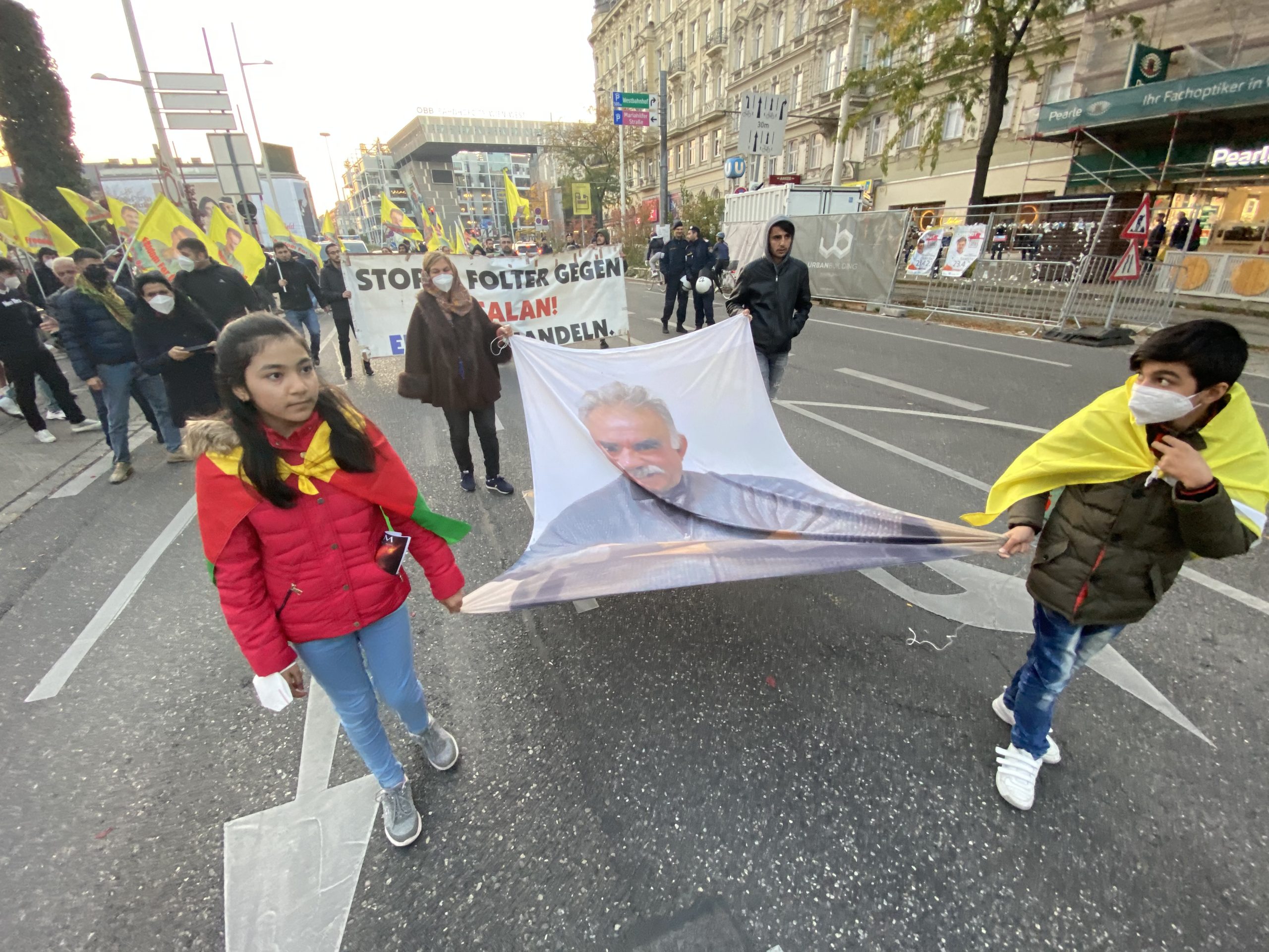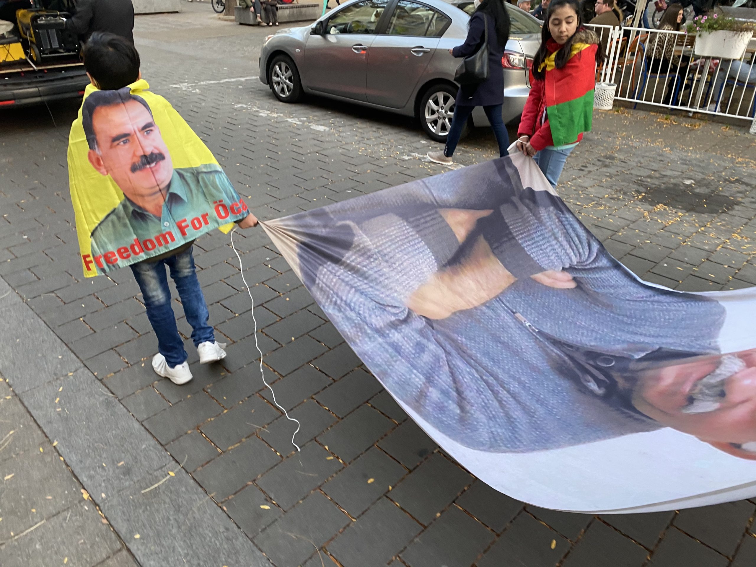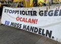 Eylemciler Önder APO bayrakları ve “Stoppt folter gegen Öcalan!” (Öcalan’a karşı işkenceyi durdurun!), “EU muss handeln.” (AB harekete geçmeli.) yazılı pankart açtılar.
