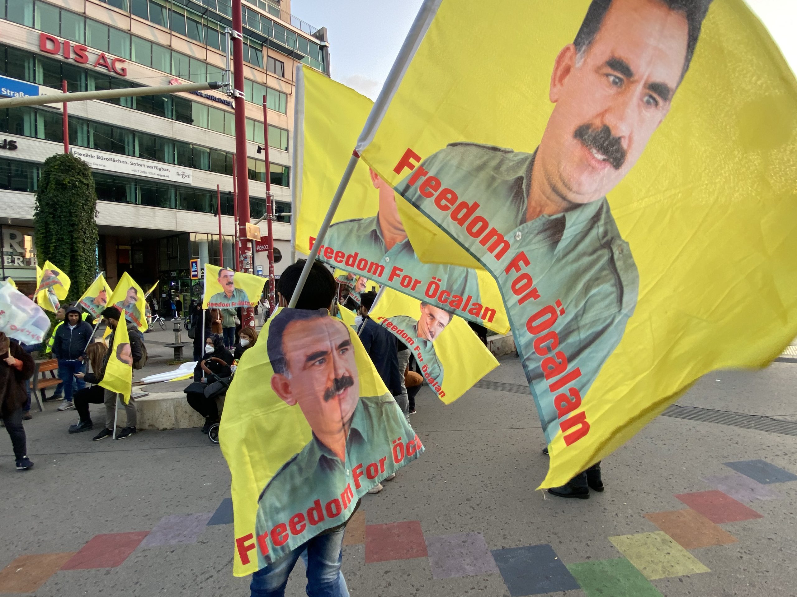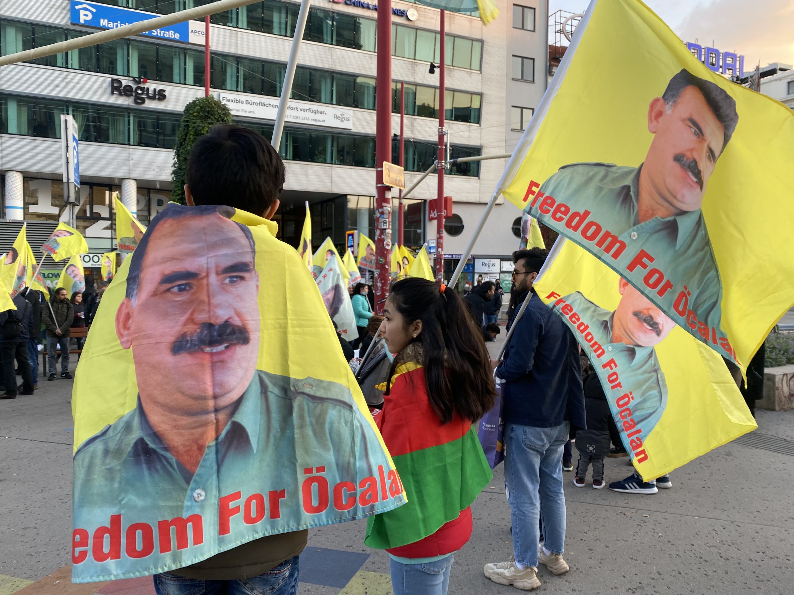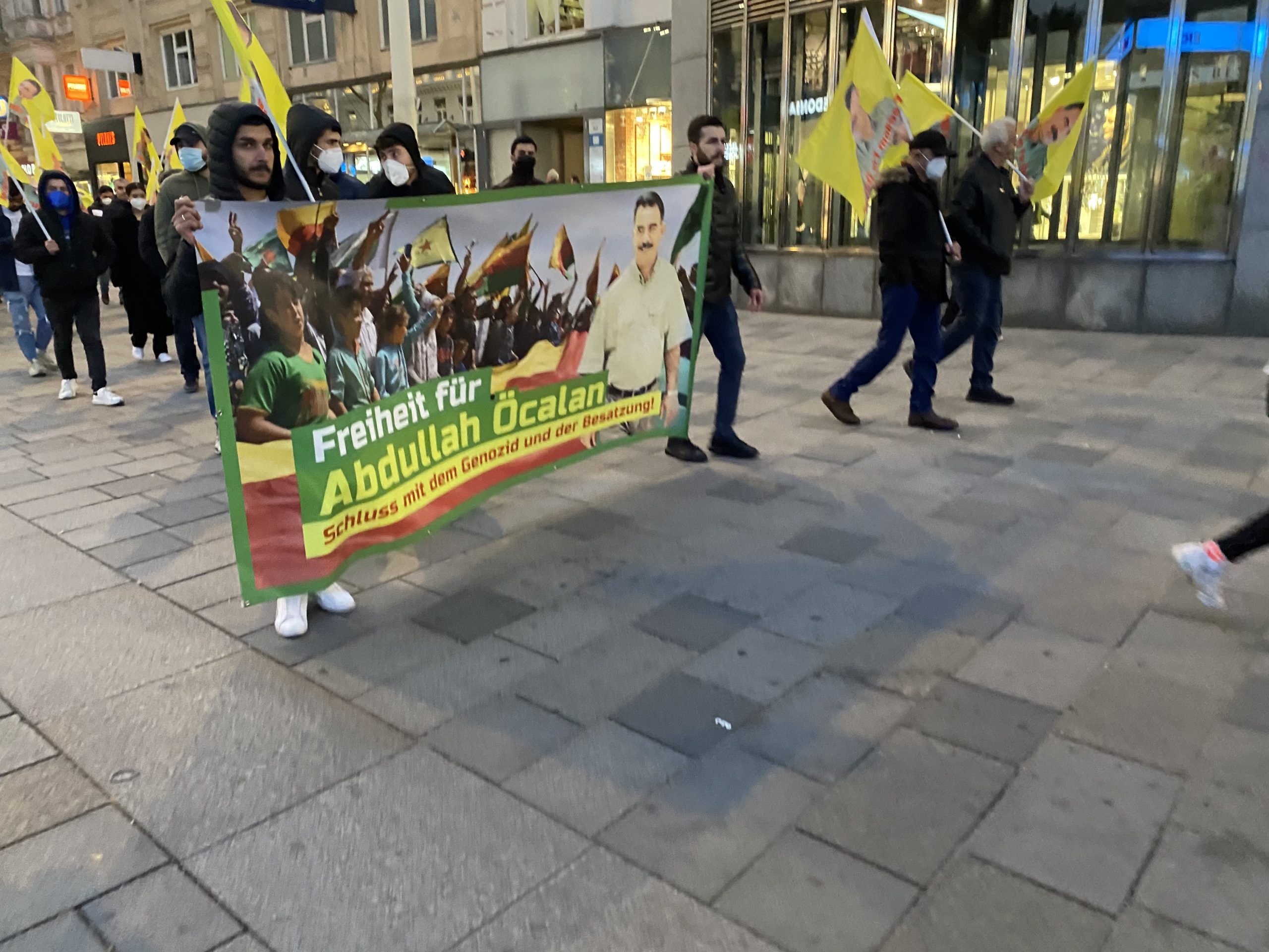 Eylemciler Önder APO bayrakları ve “Stoppt folter gegen Öcalan!” (Öcalan’a karşı işkenceyi durdurun!), “EU muss handeln.” (AB harekete geçmeli.) yazılı pankart açtılar.