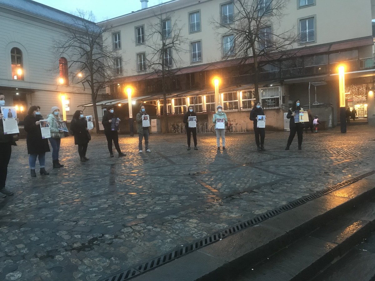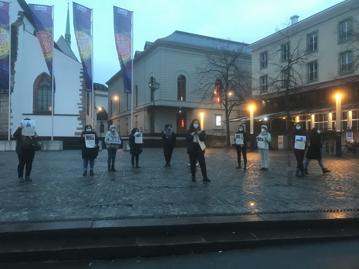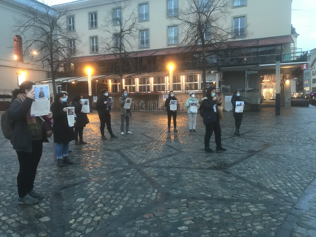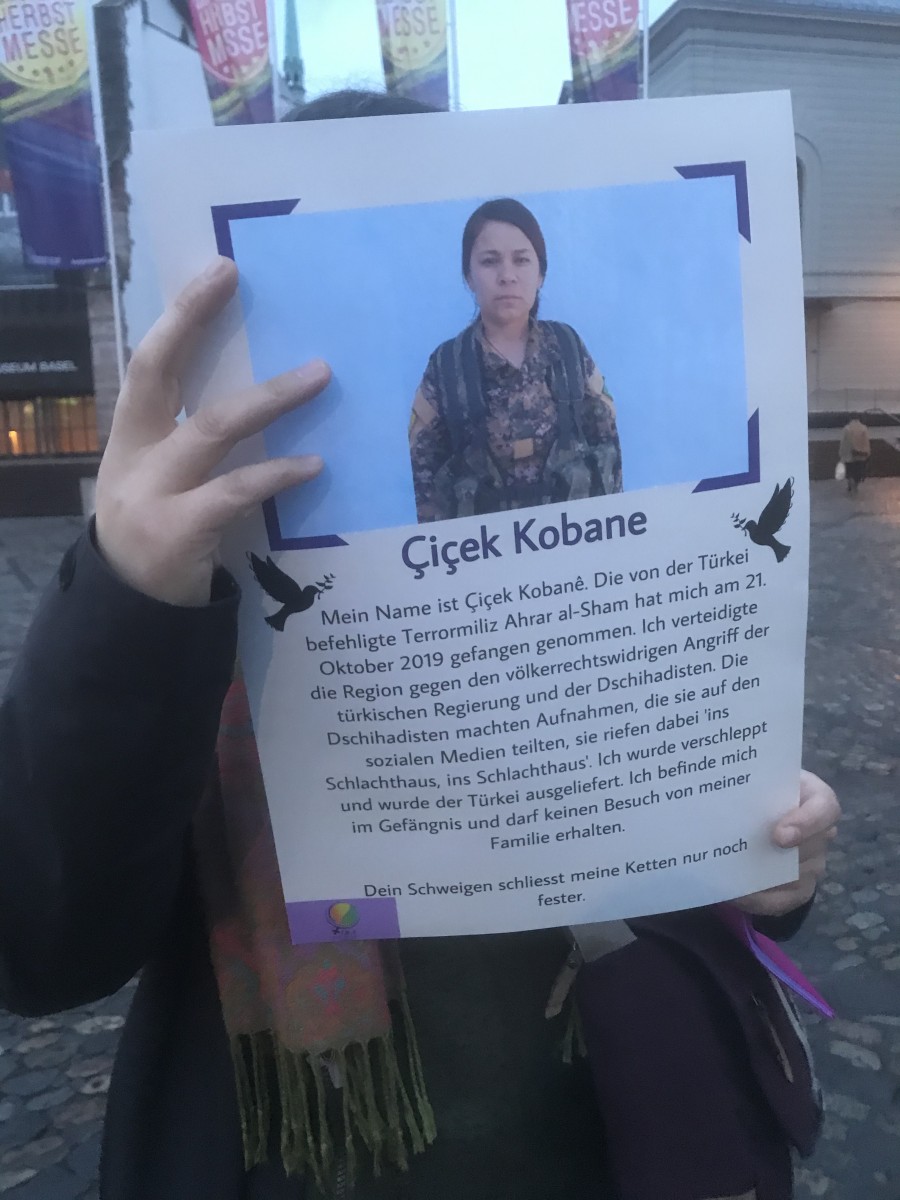 Saat 17’de Basel Barfüsserplatz’da genç kadınların toplanması ile başlayan eylemde, üzerinde erkek-devlet şiddetine ve katliamına uğramış kadınların fotoğrafları ve kısa bilgilerin olduğu dövizler açıldı.