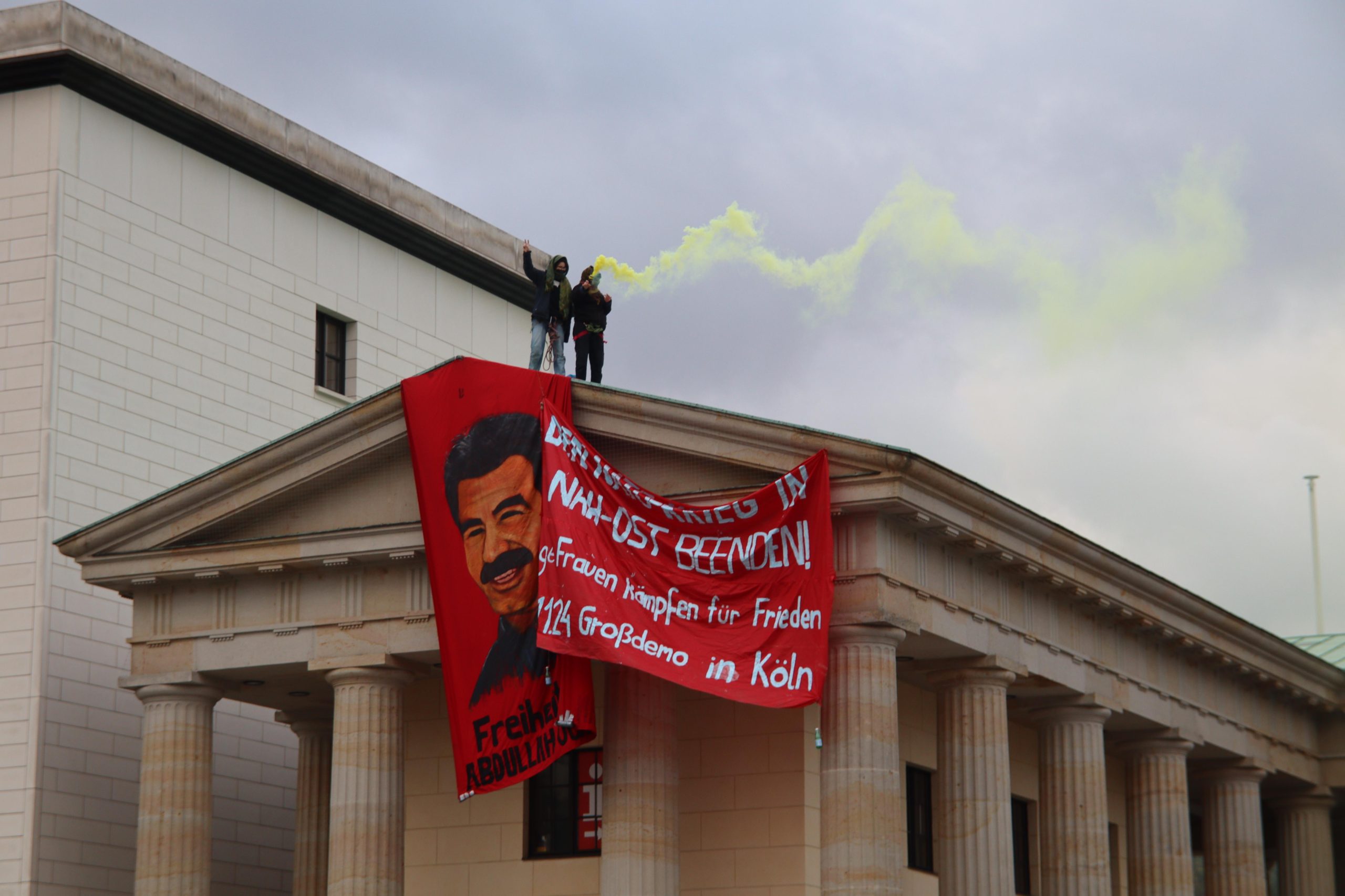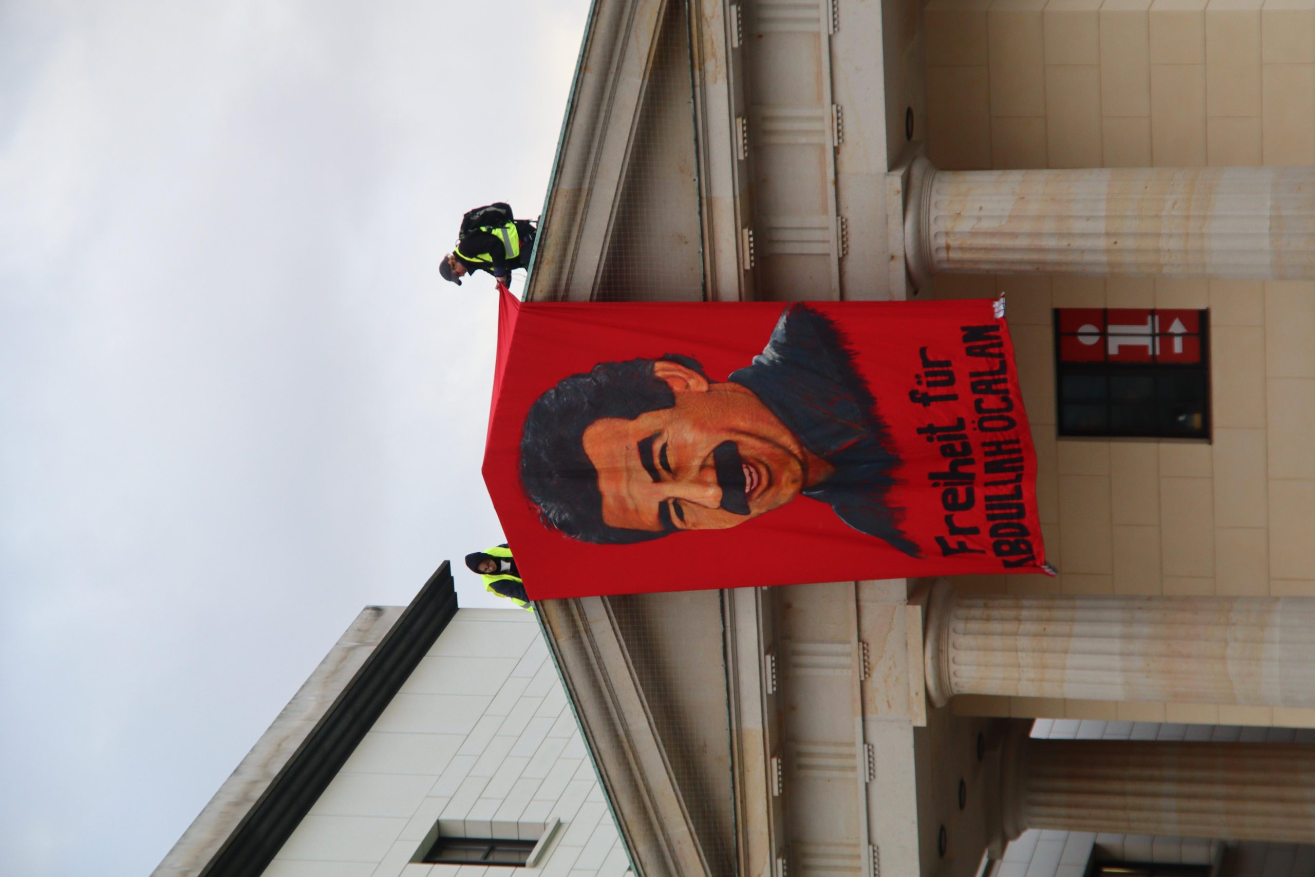 BERLİN – Almanya’nın başkenti Berlinde bulunan Brandenburg Kapısı’nda Barış için Genç Kadınlar Komitesi üyeleri pankart eylemi gerçekleştirdi. Dev Önder APO posteri ve “Abdullah Öcalan’a Özgürlük” yazısının bulunduğu pankart açan ve meşaleler yakan genç kadınlar, Önder APO üzerinde yürütülen ağırlaştırılmış mutlak tecride dikkat çekti.