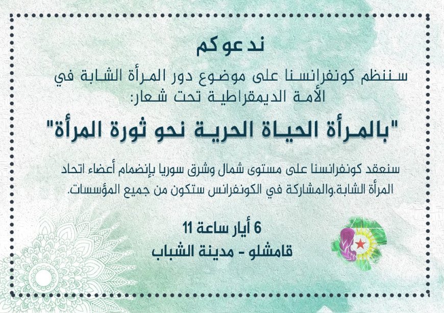 HABER MERKEZİ- Kuzey ve Doğu Suriye Genç Kadınlar Birliği, 6 Mayıs 2024 tarihinde Qamişlo’daki Wargeha Ciwanan’da “Jin, Jiyan, Azadi ile Kadın Devrimine Doğru” şiarıyla “Demokratik Ulus ve Kadın Konfederalizmi Konferansı” düzenleyecek. Konferansa, Demokratik Özerk Yönetim’in kurumlarında görev alan birçok genç kadının katılması bekleniyor.