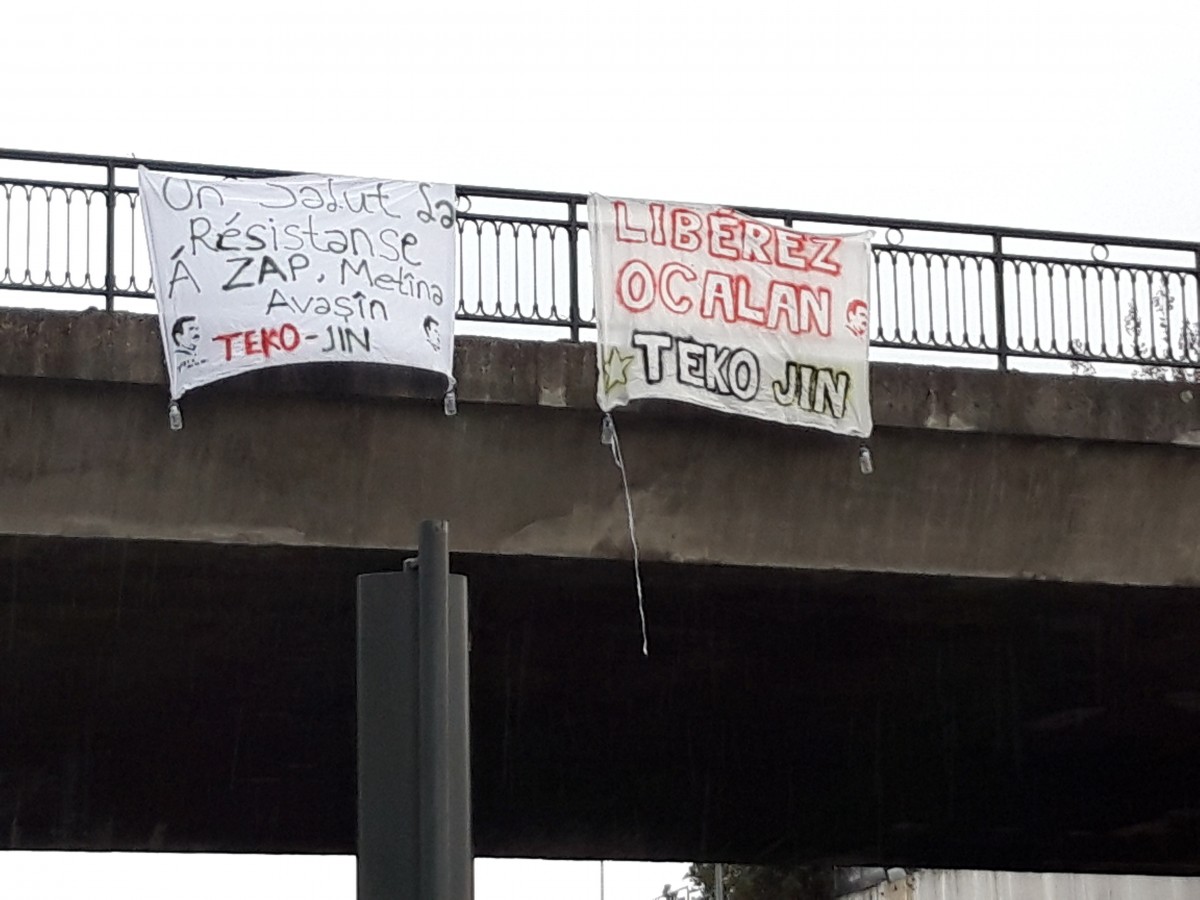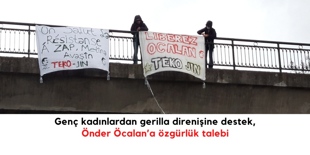 Avrupa devrimci genç kadın hareketi olan Tevgera Jinên Ciwan ên Têkoşer aktivisti genç kadınlar, Medya Savunma Alanlarına yönelik Türk işgal saldırılarına karşı direnen gerillaları desteklemek ve Önder Öcalan’ın fiziki özgürlüğüne dikkat çekmek için Fransa’nın başkenti Paris’in dış bölgelerinden olan Drancy’de bir köprüye pankart astılar.