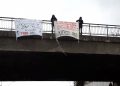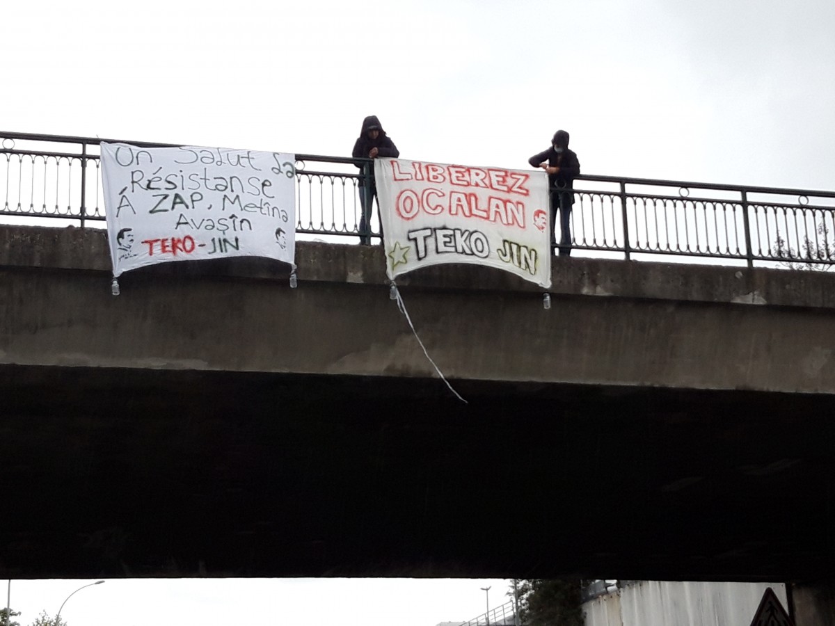 DRANCY – Halklar Önderi Abdullah Öcalan’ın 22 yıldır süren rehinelik durumu ve Türk devletinin işgal ve soykırım saldırılarına karşın büyük bir mücadele ortaya koyan Kürdistan özgürlük gerillalarına dikkat çekmek isteyen genç kadınlar Drancy’de bir üst geçide pankart astı.