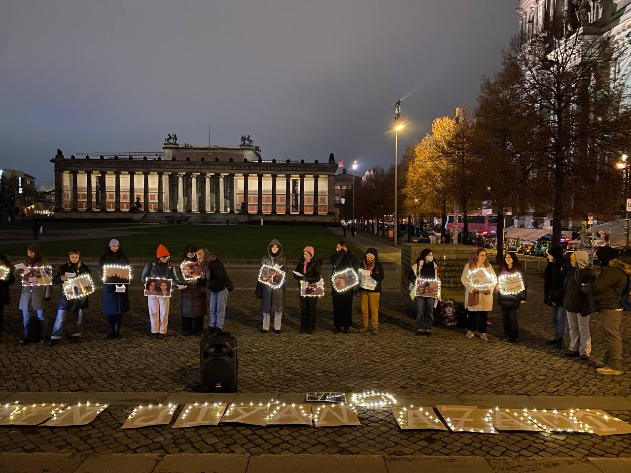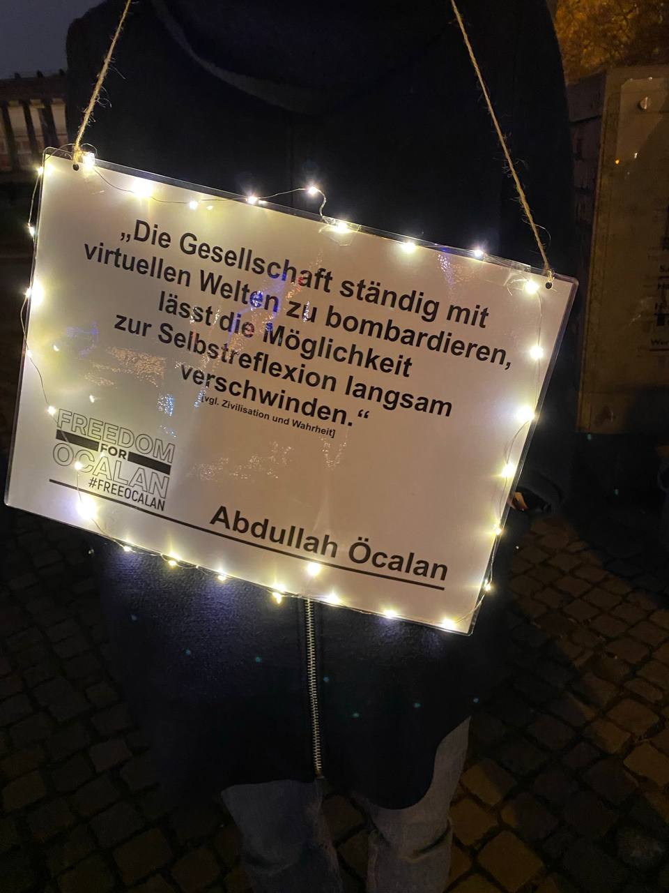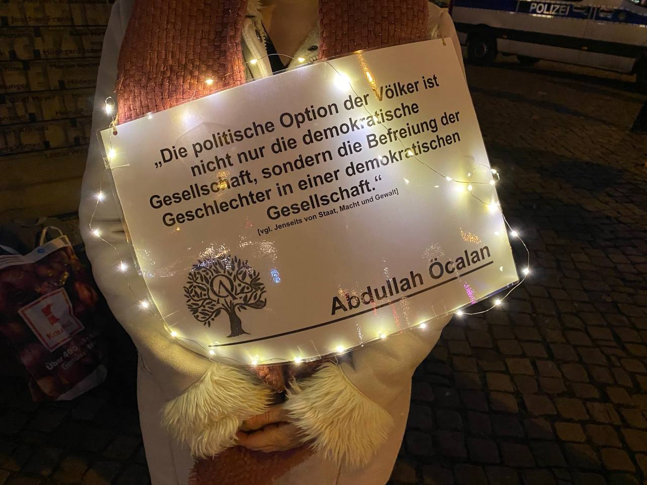 Berlin’in Berliner Dom caddesinde eylem yapan genç kadınlar, Önder APO üzerinde yürütülen ağırlaştırılmış mutlak tecride ve Rojava saldırılarına dikkat çekmek amacıyla, resim ve sözlerin yer aldığı dövizler taşıdı.