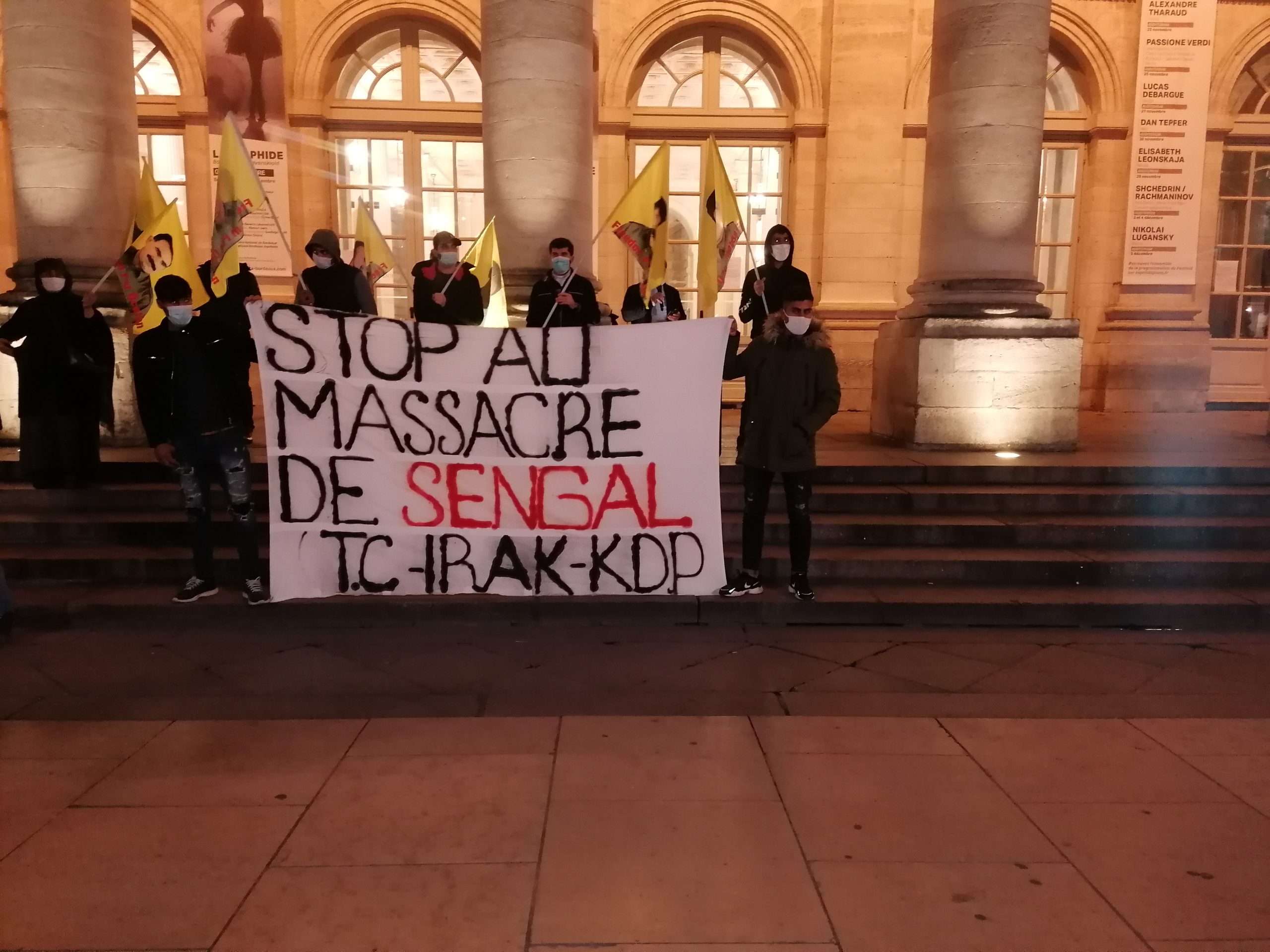 “Tecride, Faşizme, İşgale Son: Bi Hev Re Serhildan” hamlesi kapsamında düzenlenen eylem saat 19’da Grand Théâtre meydanında başladı. Halklar Önderi Abdullah Öcalan’ın posterlerinin açıldığı eylemde Fransızca, “Şengal’deki TC-Irak-KDP katliamını durdurun” yazılı pankart tutan gençler, okudukları Fransızca bir bildiri ile Şengal halkının 75’nci ferman olarak tanımladığı anlaşmayı teşhir etti. KDP’nin Şengal halkına yönelik ihanetçi tutumuna karşı sık sık, “Bimre Îxanet” sloganlarını atan gençler, Şengal halkına yönelik planlanan katliam girişimine karşı alanları bırakmayacaklarını belirttiler.