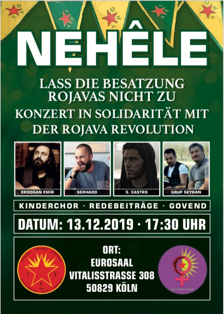 “12 Ekim’de ilanını yaptığımız yeni eylem hamlesi ‘Nehêle’ çerçevesinde gelişen ve şu anki esas gündemimiz olan Rojava işgaline karşı bir gece düzenliyoruz. TCŞ ve JCA öncülüğünde gerçekleştirilen geceye birçok çevreden yoğun bir ilgi gösterilmektedir. Nehêle hamlesi kapsamında yapılan geceye Alman dostların da yoğun bir ilgisi vardır. Etkinlik programında kurum temsilcilerinin yapacağı konuşmalar, Rojava üzerine hazırladığımız bir sinevizyon, govend ve konser yer alıyor.