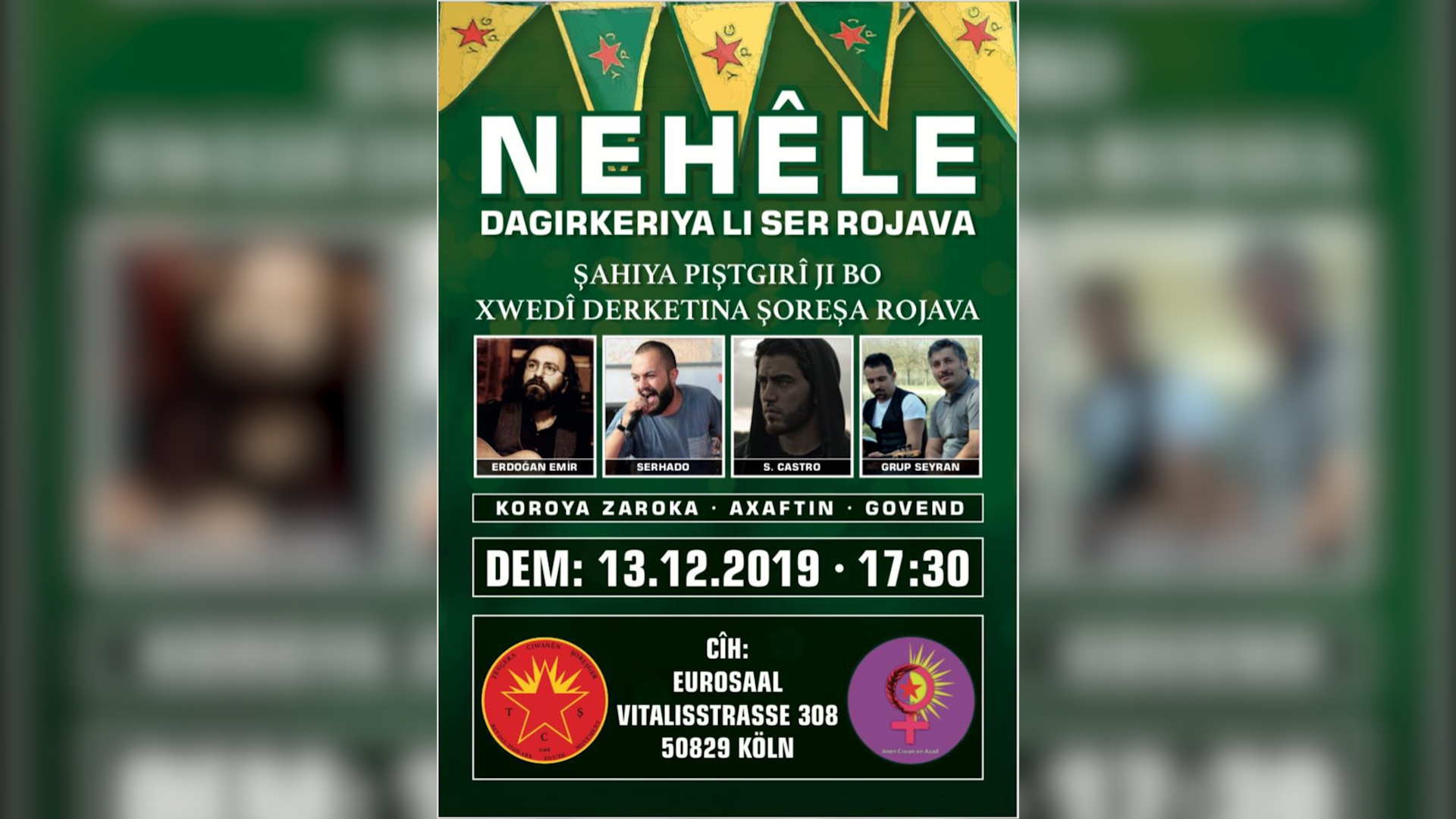 KÖLN – Tevgera Ciwanên Şoreşger ve Jinên Ciwan ên Azad, “Nehêle” hamlesi kapsamında 13 Aralık’ta “Rojava’yı işgale izin verme” şiarıyla Almanya’nın Köln şehrinde yapacakları geceye tüm gençleri davet etti. Rojava Devrimi ile dayanışma ve devrime sahip çıkmak için yapılacak gecede, sanatçılar Erdoğan Emir, Serhado, S.Castro, Grup Seyran, çocuk korosu, halay ve konuşmalar yapılacak.