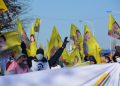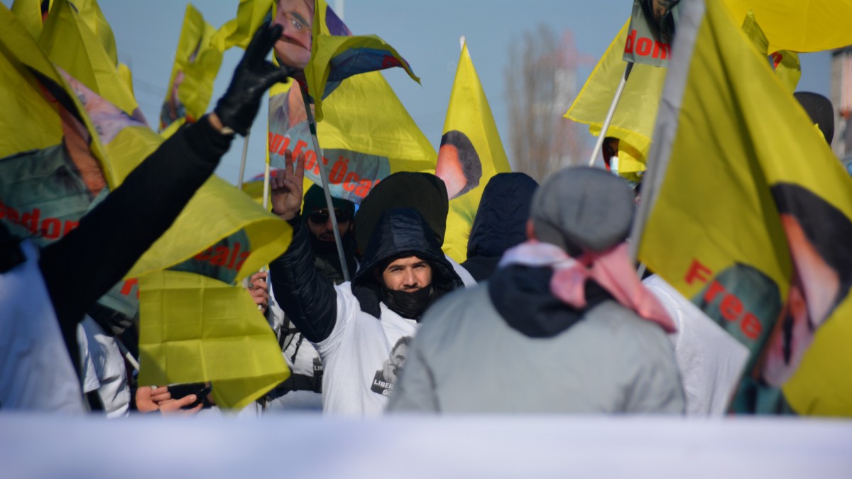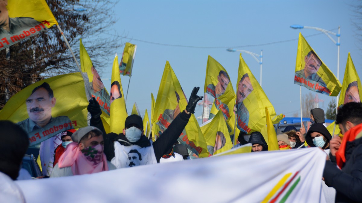 Önder Öcalan’nın posterleri ve PKK bayraklarının taşındığı yürüyüşe çevredeki halk da alkış ve zılgıtlarla destek verdi.