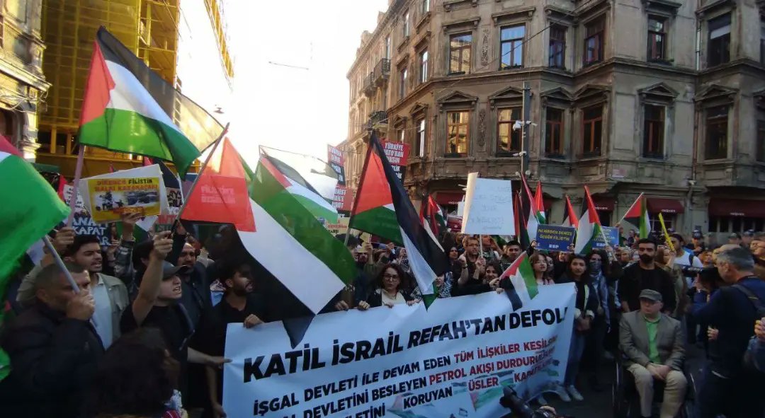 İSTANBUL-  Gençler İsrail’in Refah saldırısını Taksim Tünel Meydanında protesto etti. İşgal devleti ile devam eden tüm ilişkilerin kesilmesinin istendiği açıklamada kitle, Filistin bayrakları ve dövizleri ile Katil ABD Ortadoğu’dan Defol!, Katil İsrail Refah’tan Defol sloganları atıldı.