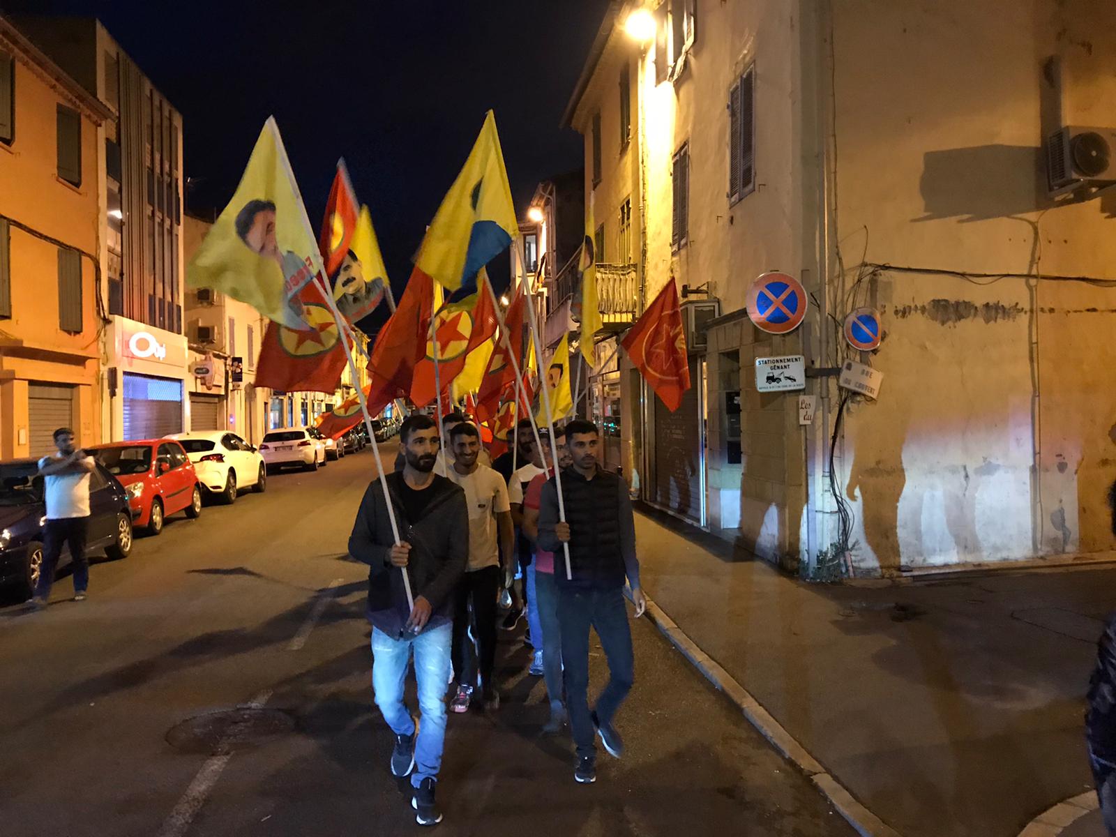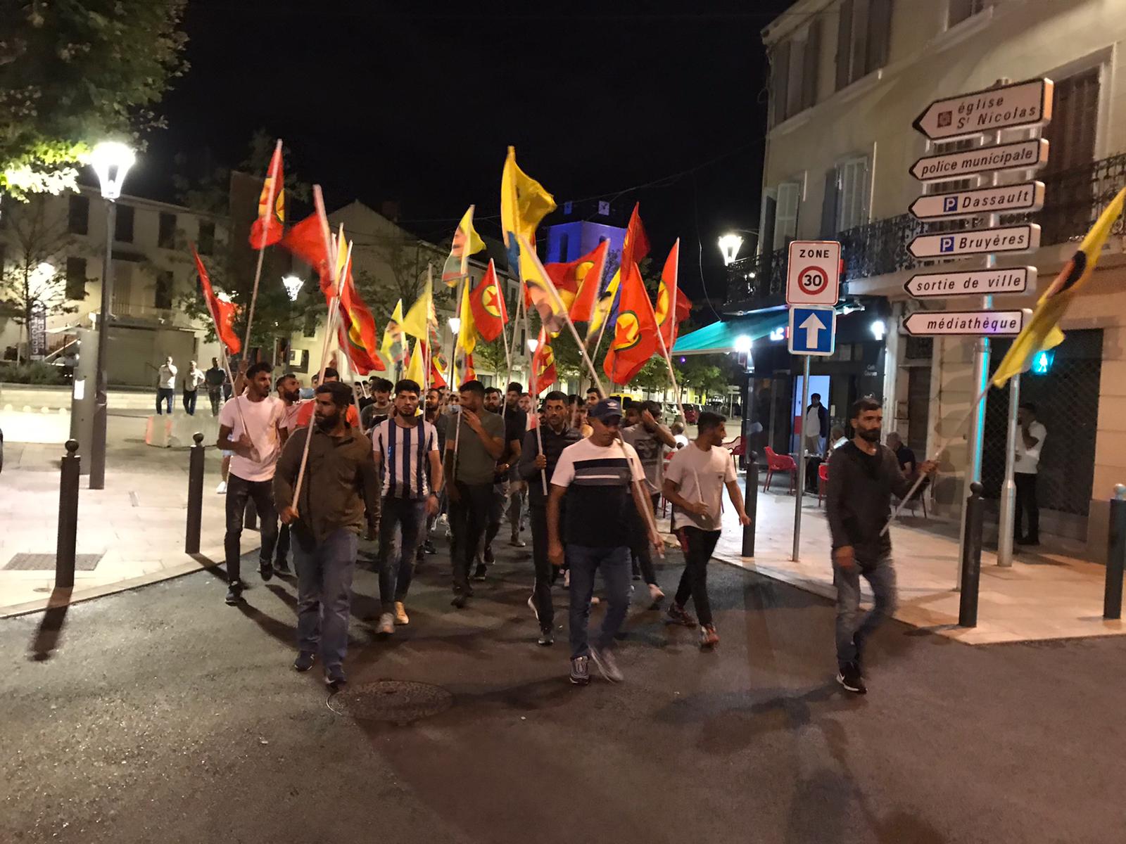 Halklar Önderi Abdullah Öcalan’ın posterleri ile PKK ve TCŞ bayraklarının açıldığı yürüyüşe çok sayıda genç katılım gösterdi. Kürdistan’daki soykırım saldırıları ve Önder Öcalan’a dönük uygulanan mutlak tecridi attıkları Fransızca ve Kürtçe sloganlar ile protesto eden gençler, cadde ve ara sokaklarda yürüyüşlerini sürdürdüler.