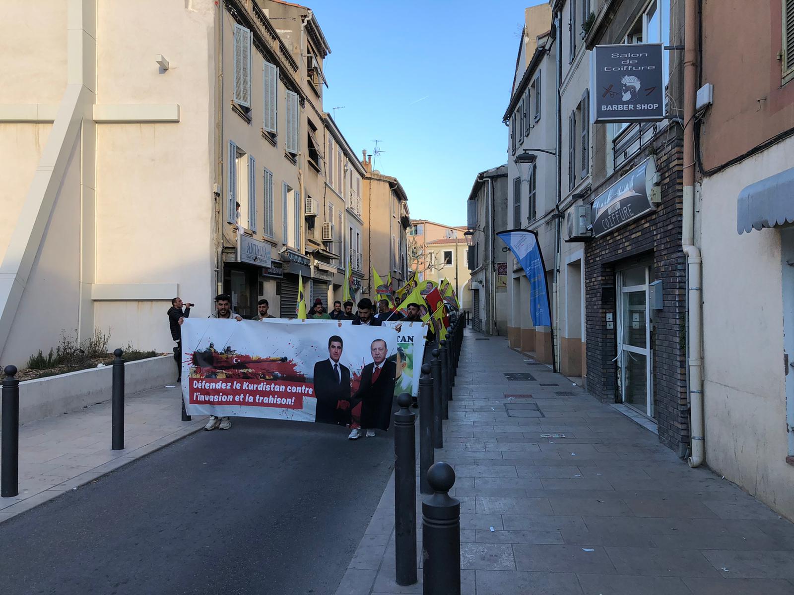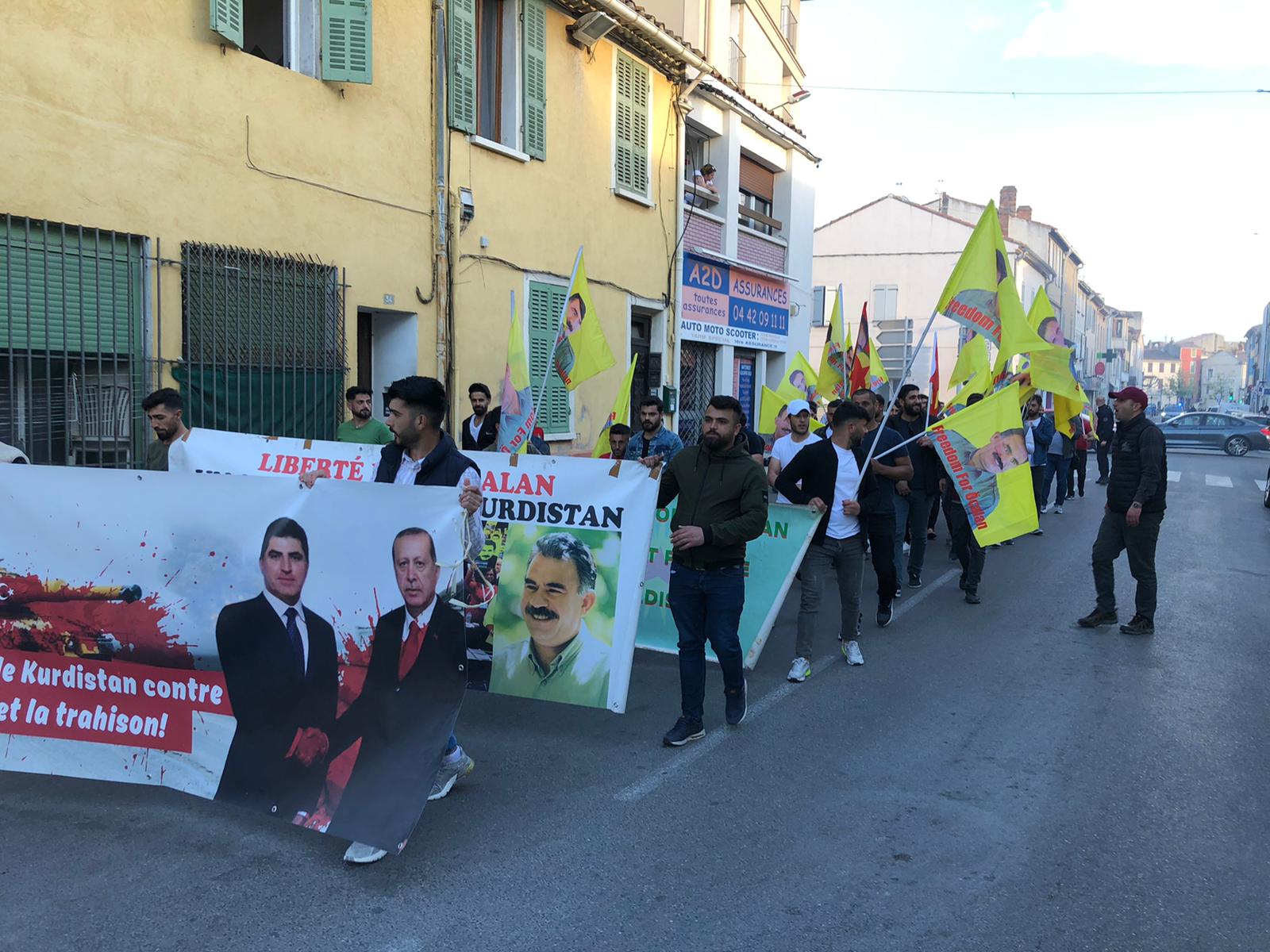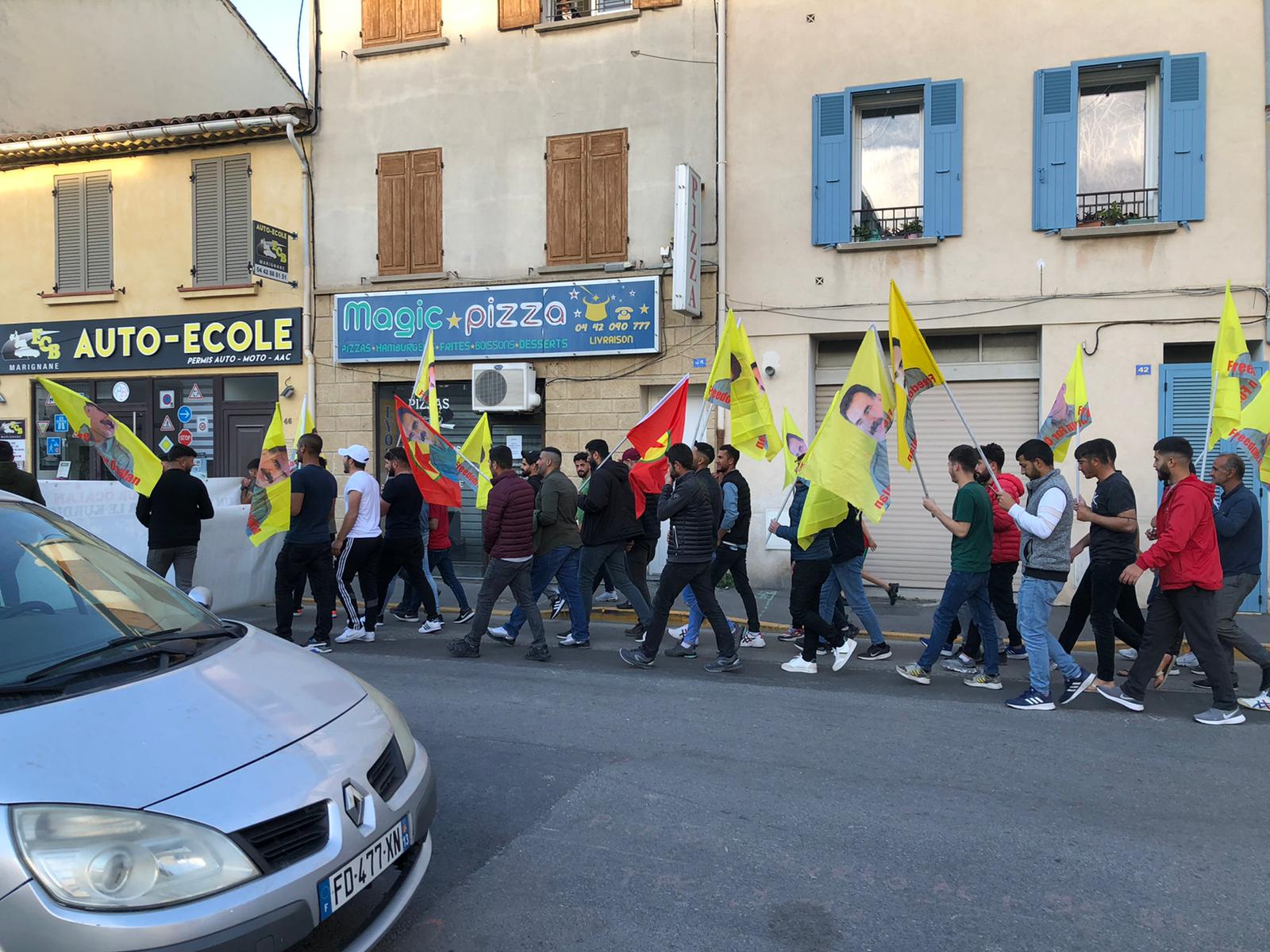 Halklar Önderi Abdullah Öcalan’ın posterleri ile PKK bayraklarının açıldığı ve meşalelerin yakıldığı yürüyüşe çok sayıda genç katılım gösterdi. Kürdistan’daki soykırım saldırıları ve Önder Öcalan’a dönük uygulanan mutlak tecridi attıkları Fransızca ve Kürtçe sloganlar ile protesto eden gençler, cadde ve ara sokaklarda yürüyüşlerini sürdürdüler.