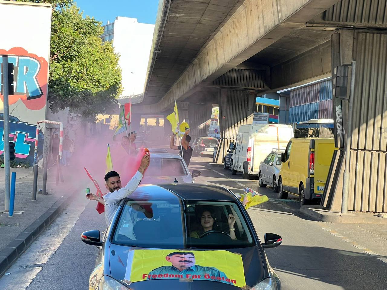 Ardından Gençlik Öncülüğünde Marsilya Sokaklarında renkli Meşaleler ile üzerinde Önder APO’nun resminin yer aldığı onlarca araçlık konvoyu gerçekleştirilerek Marsilya sokakları “Bijî Serok APO” sloganları ile inletildi.