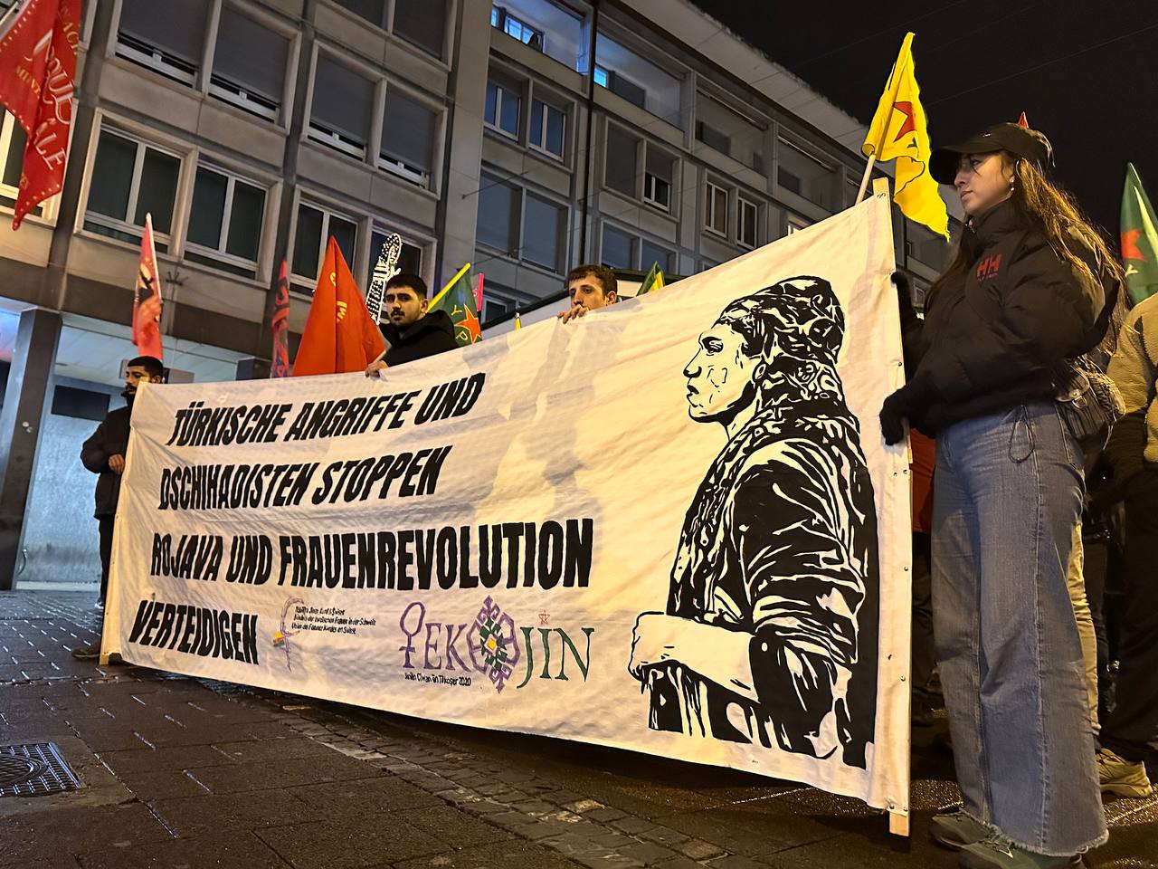 İşgal saldırılarına ilişkin KCKD-E’nin Almanca basın metninin okunduğu eylemde Basel Demokratik Kürt Toplum Merkezi adına Kemal Uzun bir konuşma yaptı. Saldırılara karşı QSD güçleri ile halkın direnişini selamlayan Uzun “İşgal saldırıları sona ermeyene kadar alanları terk etmeyeceğiz” diye konuştu.