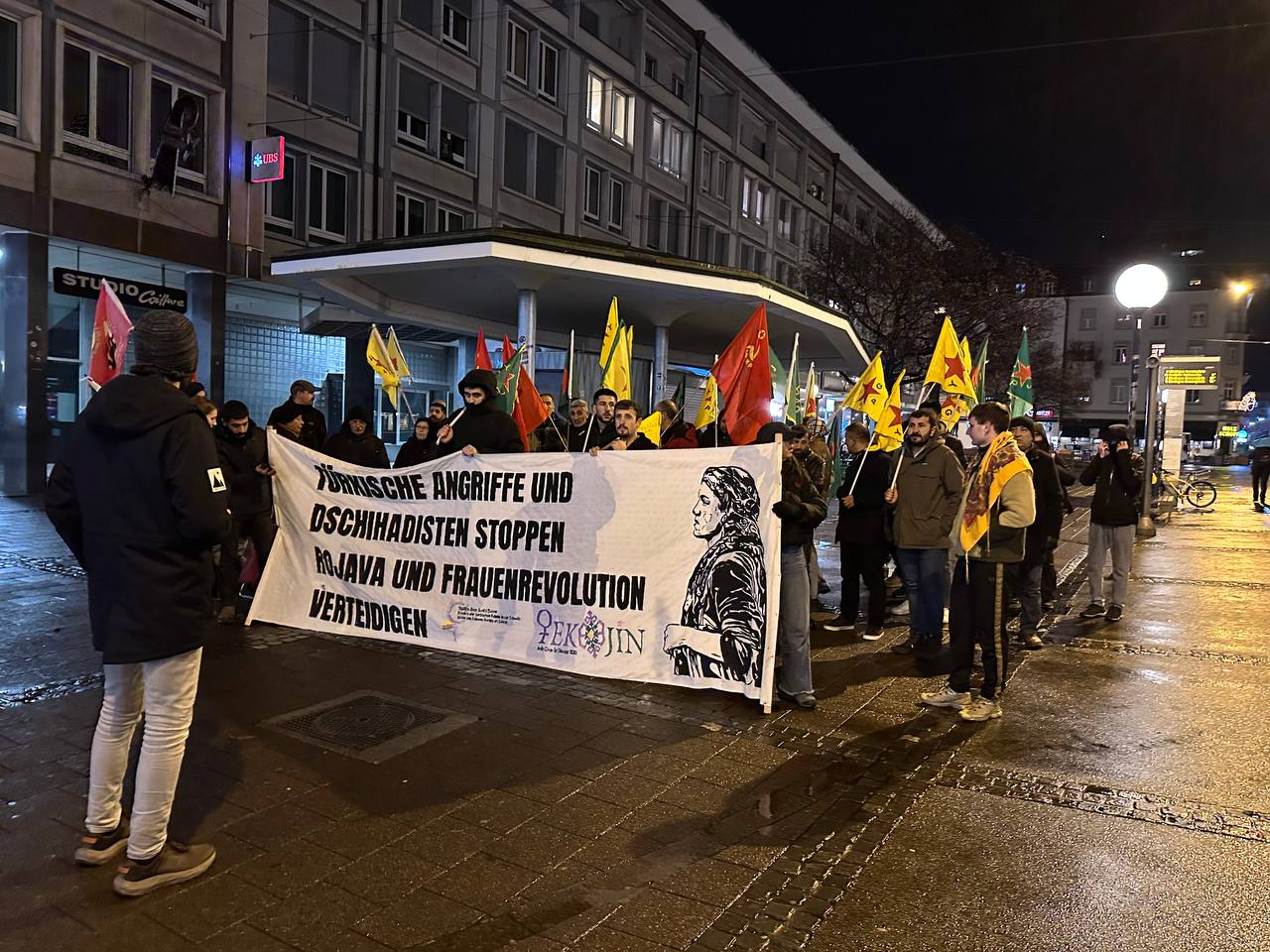 Ardından yürüyüşe geçen eylemciler, yürüyüş boyunca “Biji Berxwedana Rojava”, “Bijî Berxwedana YPG-YPJ” sloganları attı. Yürüyüş Claramätte Meydanı’nda sonlandırdı.