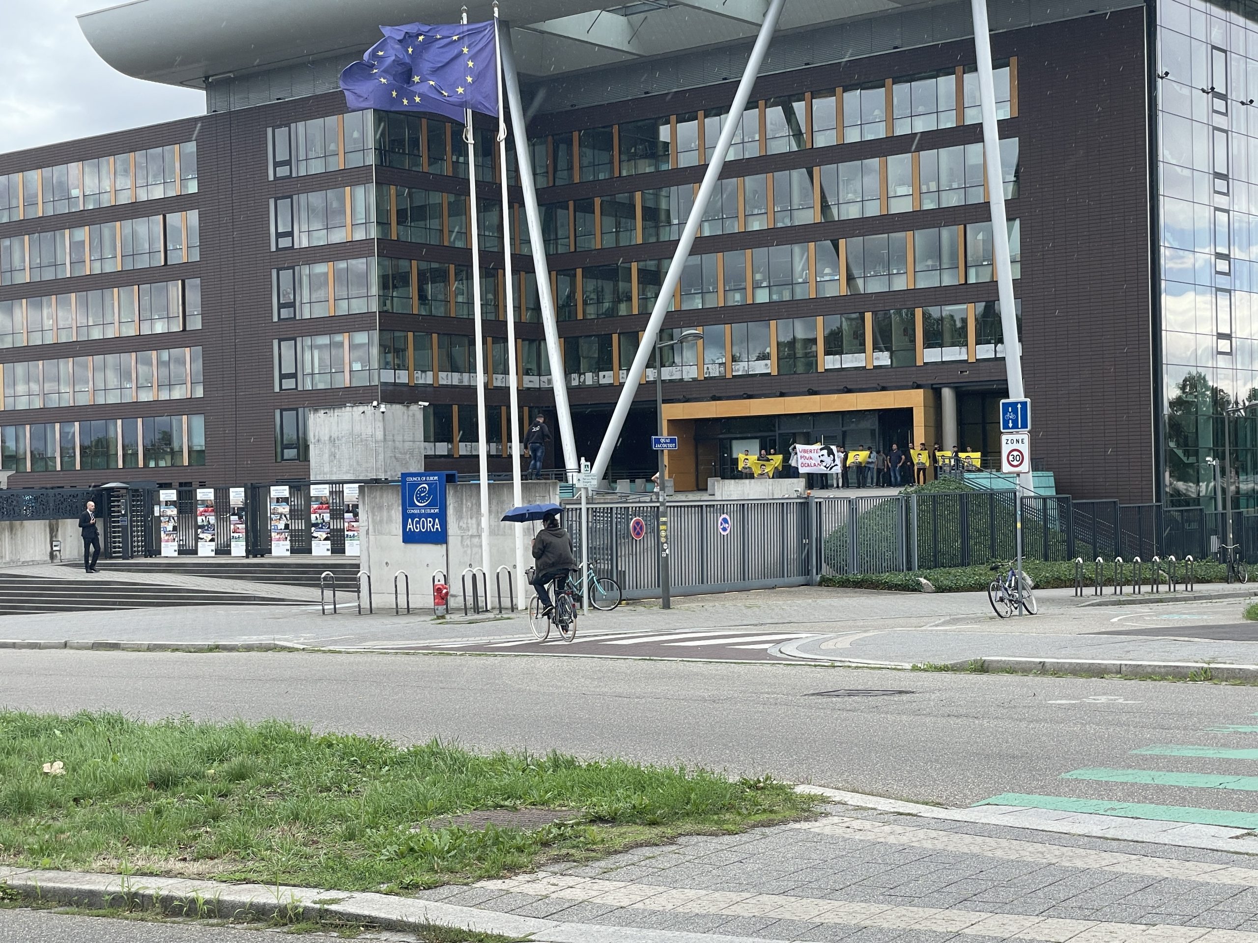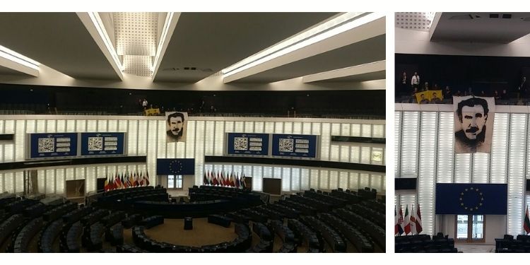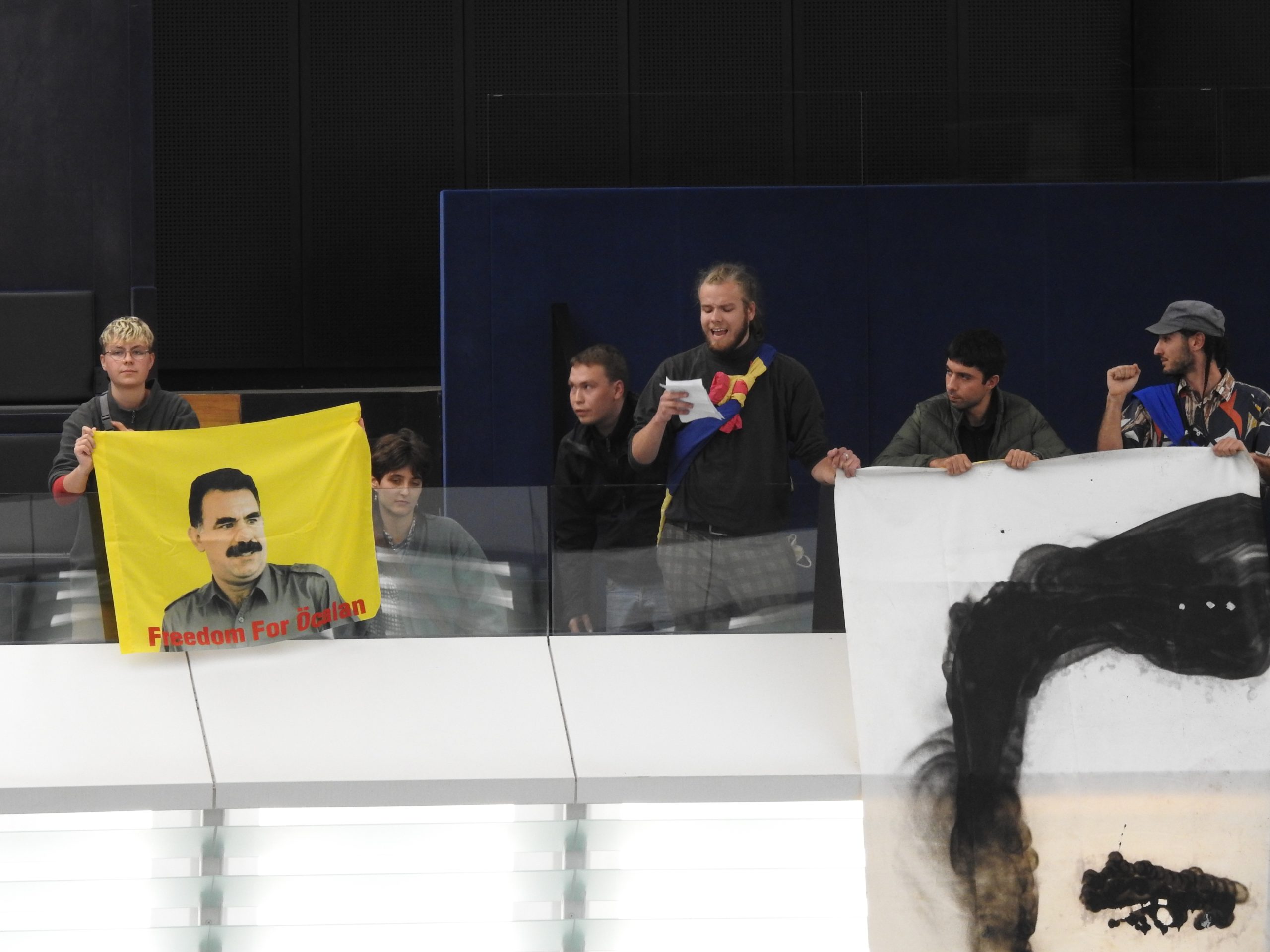 Üçüncü eylem noktası ise Avrupa Parlamentosu idi. AP binası içerisinde bir araya gelen enternasyonalist gençler Önder APO’nun fiziki özgürlüğünün sağlanması için sivil itaatsizlik eylemi gerçekleştirdi.