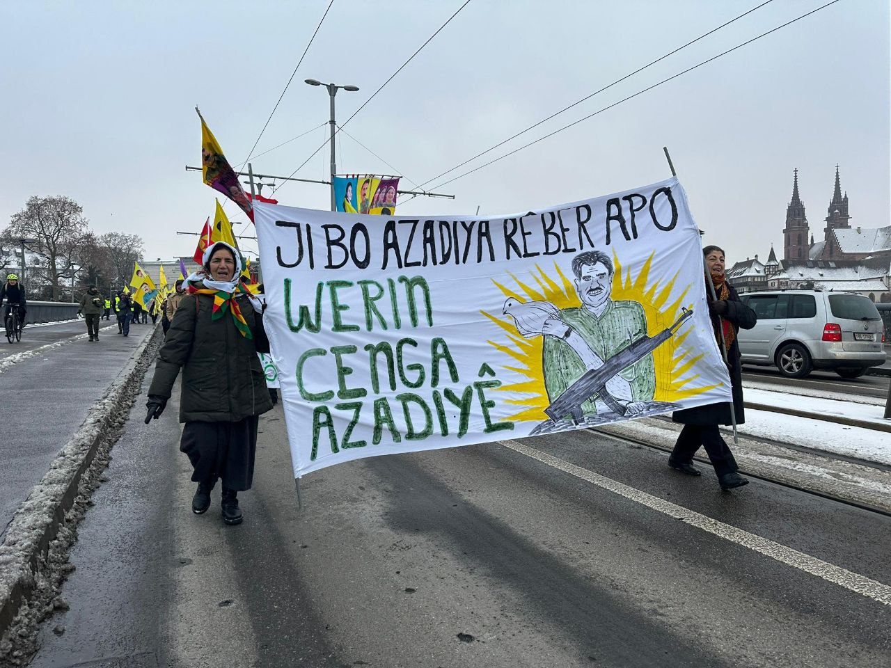 Alanda Önder APO’ya özgürlük pankartları açılırken, “Be Serok Jiyan Nabe” sloganları haykırılıyor.
