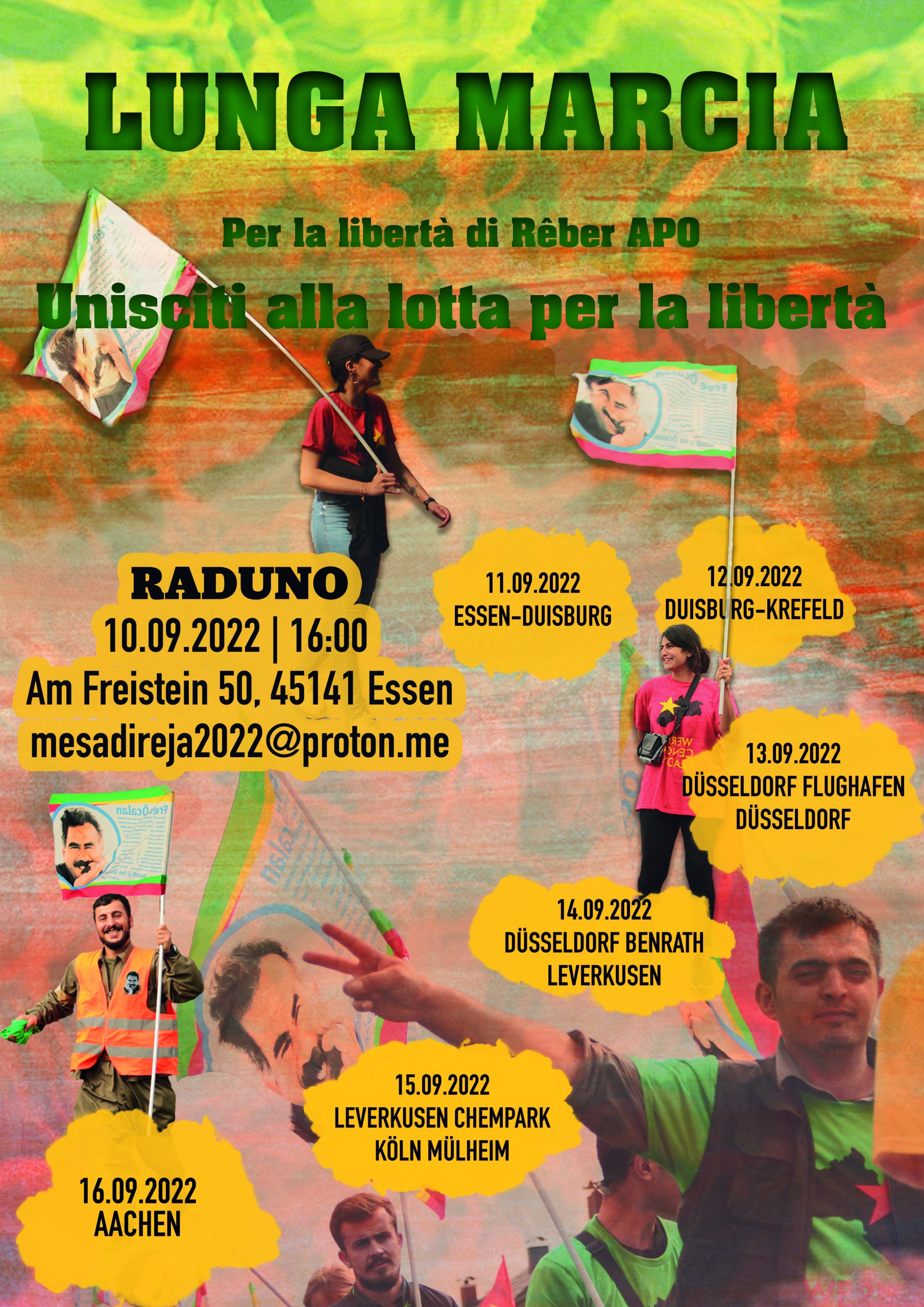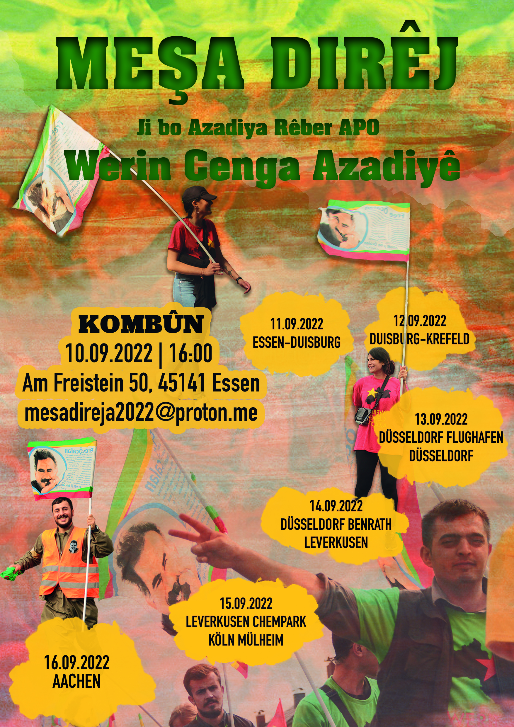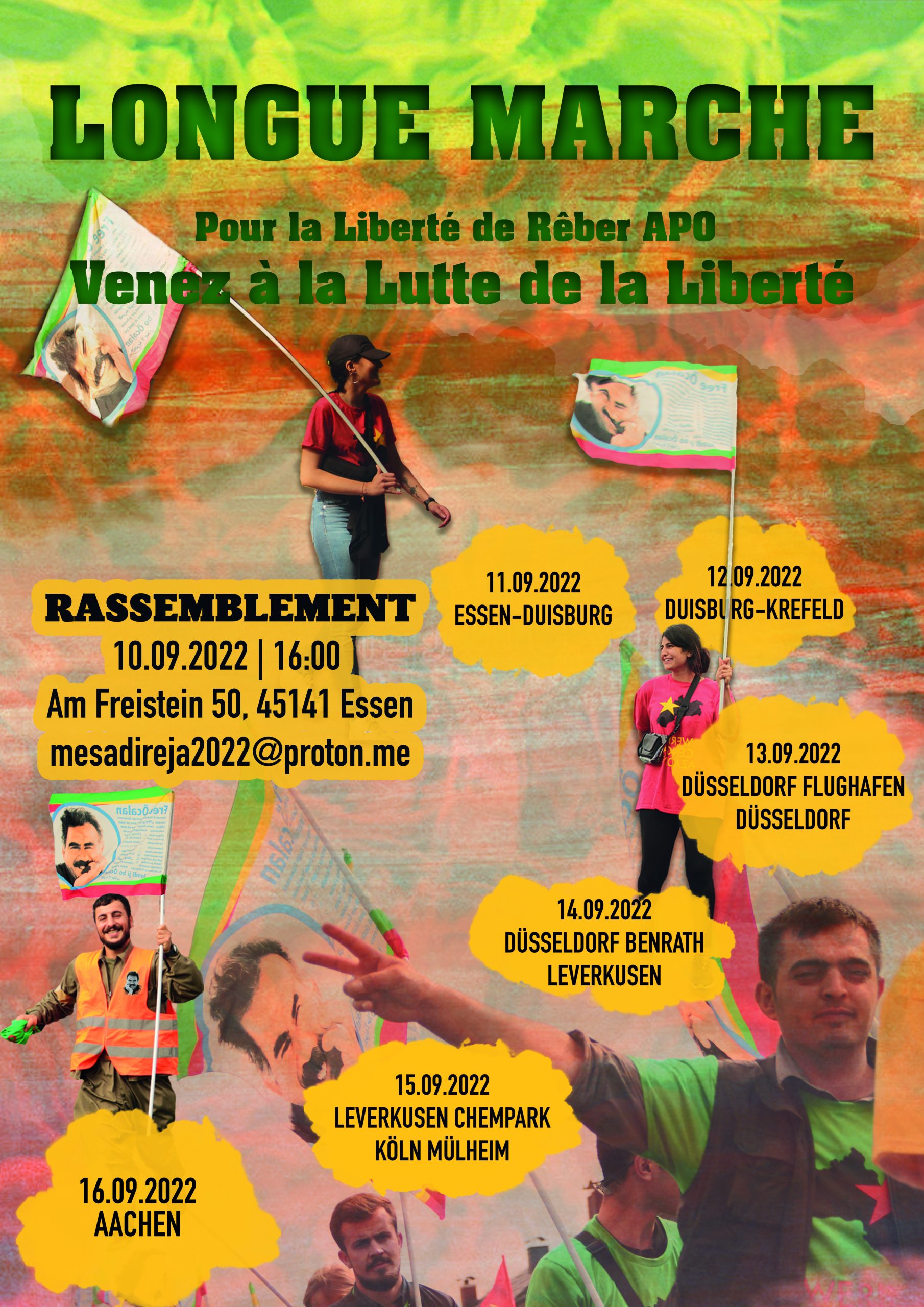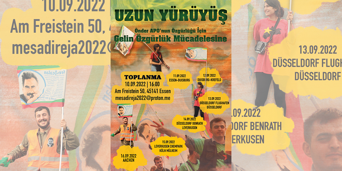 “Bu temelde, 11-16 Eylül tarihlerinde Almanya’nın Essen şehrinde başlayacak ve Aachen’a kadar devam edecek Uzun Yürüyüş eylemimizi Rêber APO’ya özgürlük talebiyle gerçekleştireceğiz. Avrupa’da yaşayan tüm Kürt ve enternasyonalist gençleri “Önder APO’ya Özgürlük için, Gelin Özgürlük Mücadelesine” şiarıyla, seferberlik halinde Rêber APO’nun özgürlüğünü haykırmaya çağırıyoruz.” Denildi.