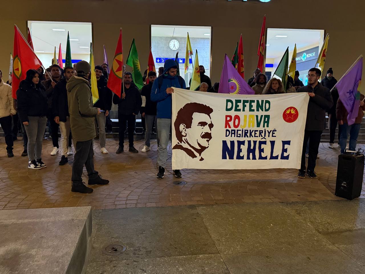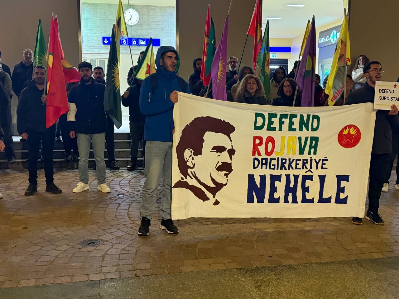 Eylemde Önder APO flamaları, PKK, KCK, YPG, YPJ bayrakları ve “Defend Rojava, Dagirkeriyê Nehêle” (Rojava’yı Savun, İşgale İzin Verme) yazılı pankart açıldı.